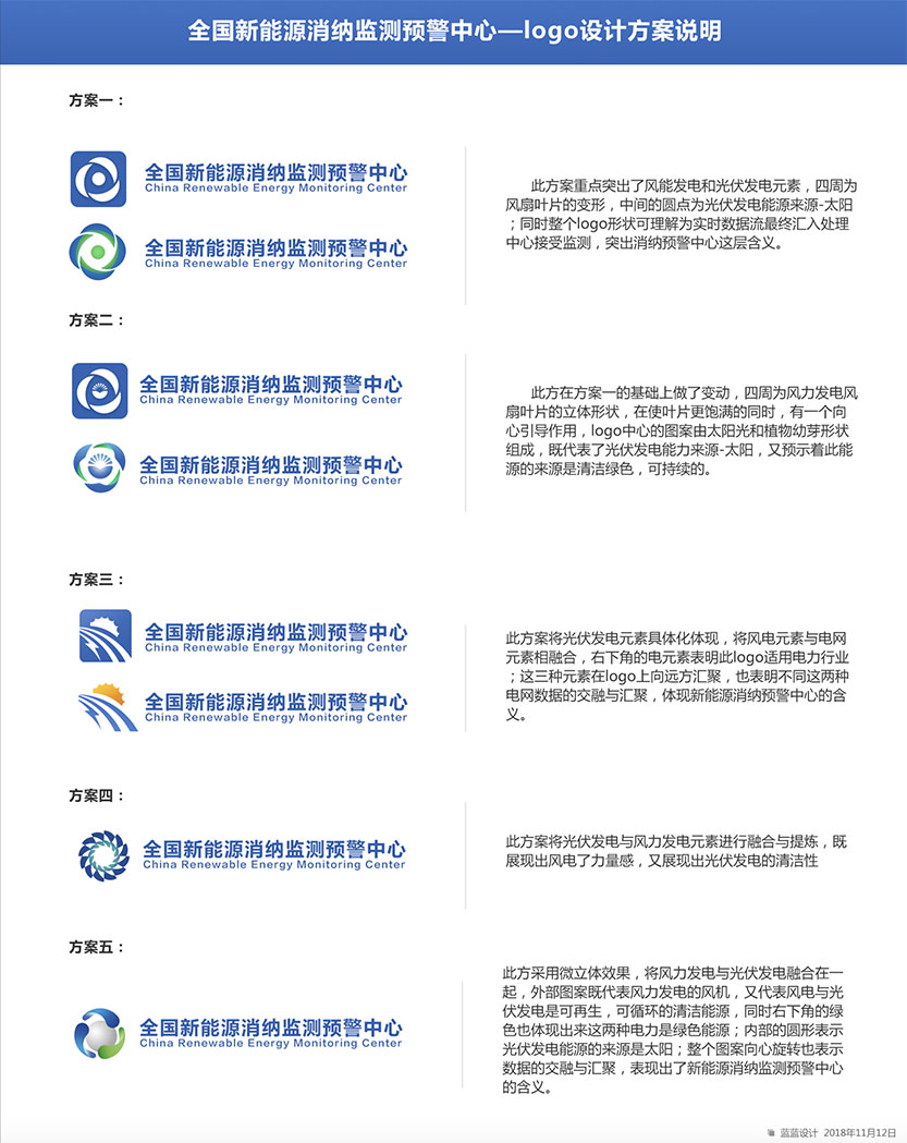 制約新能源消納的關(guān)鍵因素,為新能源的優(yōu)化布局和行業(yè)政策制定提供參考,促進(jìn)我國新能源高質(zhì)量發(fā)展。 藍(lán)藍(lán)設(shè)計(jì)對全國新能源消納監(jiān)測預(yù)警中心的工作范圍做了調(diào)查研究,首先理解業(yè)務(wù)和核心競爭力,之后調(diào)查了行業(yè)相關(guān)品牌標(biāo)志設(shè)計(jì),聽取了大家的期望,之后設(shè)計(jì)出多版logo供選擇。標(biāo)志設(shè)計(jì)確定后進(jìn)行了VI和宣傳冊的設(shè)計(jì)。