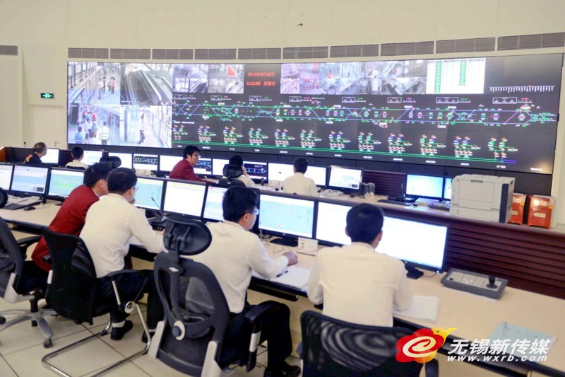 相關(guān)負(fù)責(zé)人介紹,大屏幕最上方一個(gè)個(gè)顯示著列車、車站景象的小窗口是1號(hào)線各個(gè)站點(diǎn)的實(shí)時(shí)監(jiān)控圖像,可以清晰看見(jiàn)地鐵內(nèi)發(fā)生的情況。下面有著紫色綠色條紋的一幅幅圖像就是地鐵的信號(hào)系統(tǒng),哪輛車行到哪里,間隔多少,是否有情況需要停車……這里一目了然,調(diào)度人員就是在同步的電腦屏幕上進(jìn)行調(diào)度,保證地鐵正常運(yùn)營(yíng)。最下面的是供電系統(tǒng),停電、變電、送電等操作都在這上面完成。