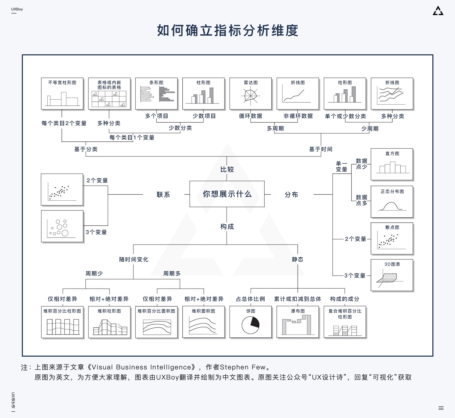 當(dāng)確定好分析維度后,事實(shí)上我們所能選用的圖表類型也就基本確定了。接下來我們只需要從少數(shù)幾個圖表里篩選出最能體現(xiàn)我們設(shè)計意圖的那個就好了。
