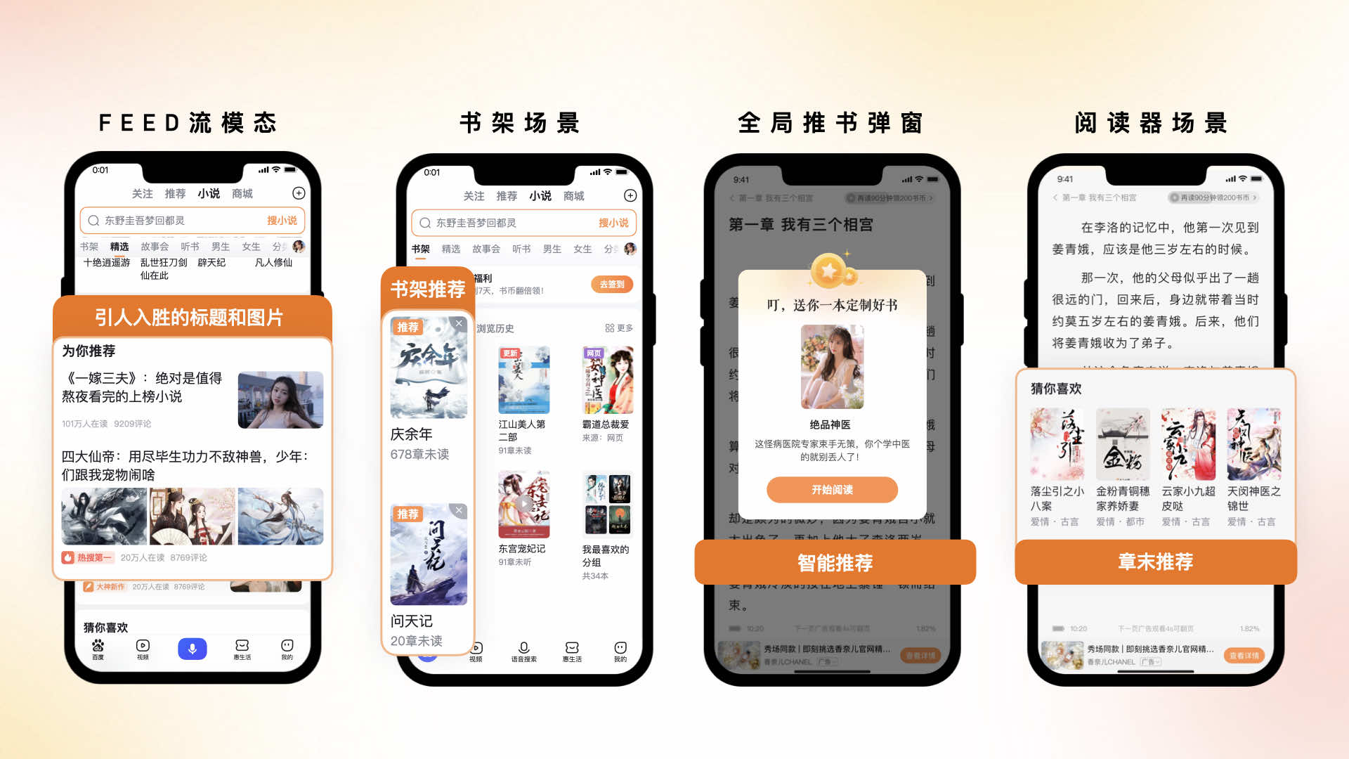 在推薦形式上,我們也采用了多樣化的推薦方式。例如在首頁增加了feed流形態(tài)的信息模塊,以更直觀的圖文展現(xiàn)方式,幫助用戶發(fā)現(xiàn)他感興趣的內(nèi)容。在書架場景,針對于書架內(nèi)容少的用戶,自動(dòng)的放置兩本高流量書籍,幫助用戶高效的觸達(dá)內(nèi)容。與此同時(shí),我們還會根據(jù)用戶行為數(shù)據(jù),采用彈窗形式和章尾推薦等形式主動(dòng)向用戶推薦與其喜好度高的內(nèi)容,方便用戶高效的觸達(dá)他感興趣的內(nèi)容。