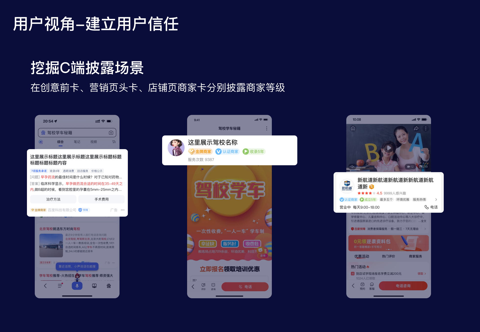 從用戶視角出發(fā),商家等級項(xiàng)目的主要目標(biāo)是建立用戶信任,所以設(shè)計(jì)師在強(qiáng)化徽標(biāo)設(shè)計(jì)的同時(shí),更需要挖掘用戶視角的披露場景,通過增加C端披露,幫助用戶了解該商家在百度生態(tài)內(nèi)的等級情況,以輔助用戶決策。本項(xiàng)目中在C端共新增3個(gè)場景進(jìn)行商家等級的披露,①搜索前卡;②營銷頁頭卡;③店鋪頁首卡。在3個(gè)重點(diǎn)場景披露商家的等級徽標(biāo),用戶在選擇商家時(shí)可以參考商家的等級,增強(qiáng)對商家的信任和認(rèn)知。