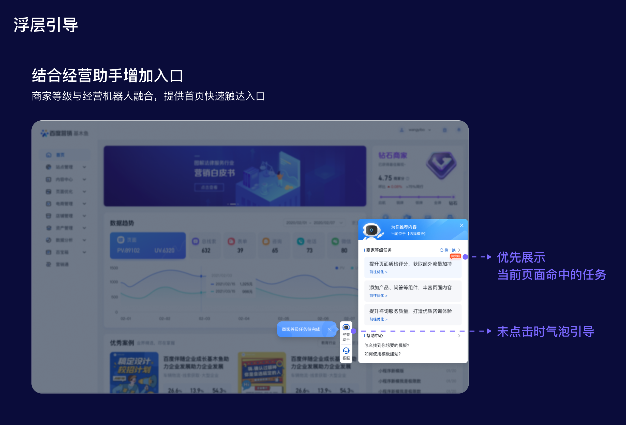 浮層:將操作入口前置披露,提升商家感知同時(shí)還可以縮短操作步長。在商家等級項(xiàng)目里,衡量商家主動(dòng)經(jīng)營的標(biāo)準(zhǔn)是做任務(wù),所以任務(wù)入口的前置披露是提升主動(dòng)經(jīng)營的關(guān)鍵舉措。于是,圍繞商家等級包裝了“經(jīng)營助手”的概念,幫助平臺給商家推薦一些成長任務(wù)和優(yōu)化建議,并在平臺首頁主動(dòng)彈出,以此提高任務(wù)觸達(dá)率。但使用這種主動(dòng)觸達(dá)手段時(shí),需要考慮對商家的打擾和阻斷情況,所以需要對主動(dòng)彈出的頻率作限制,然后配合氣泡和標(biāo)簽等視效元素吸引商家視線。這樣可以引導(dǎo)商家參與商家等級完成任務(wù),促進(jìn)其成長和等級提升。