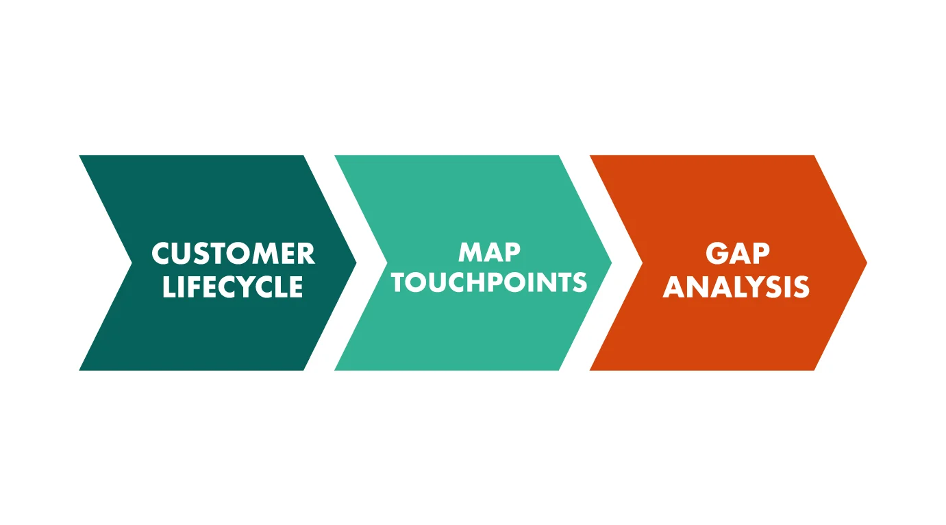 該過程需要繪制客戶旅程,繪制出他們的接觸點(diǎn)以及你的接觸點(diǎn),以識(shí)別溝通中的差距。在這里,我們?yōu)槟闾峁┝死L制客戶旅程的模板和框架。