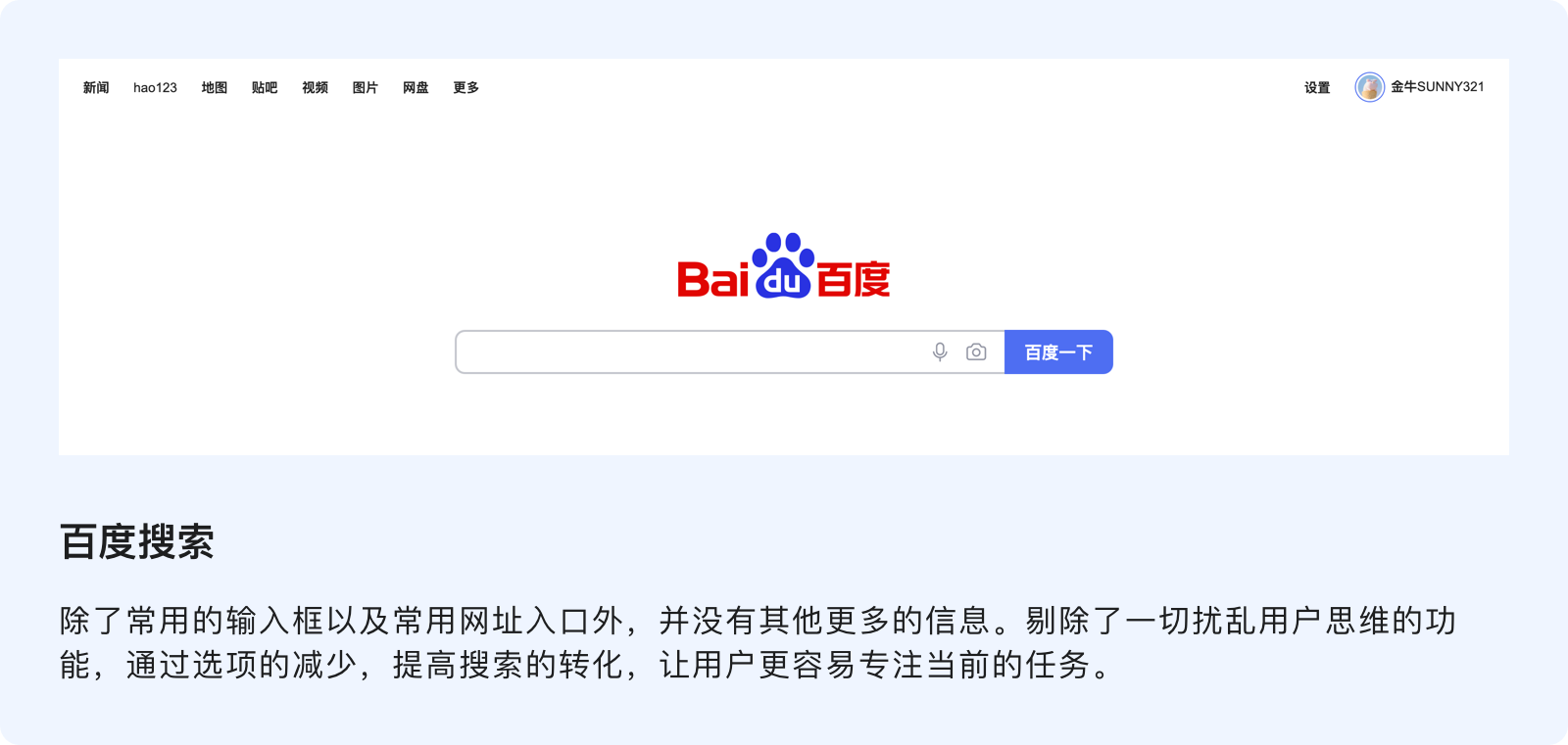 網(wǎng)頁通過大面積的留白營造平和感,通過高反差的對比創(chuàng)造視覺焦點(diǎn),將必要的信息烘托出來,然后借助留白包圍它們。通過這種方式把核心信息凸顯出來,當(dāng)用戶進(jìn)入該搜索頁時,只做必要的事情,關(guān)注重要的信息。