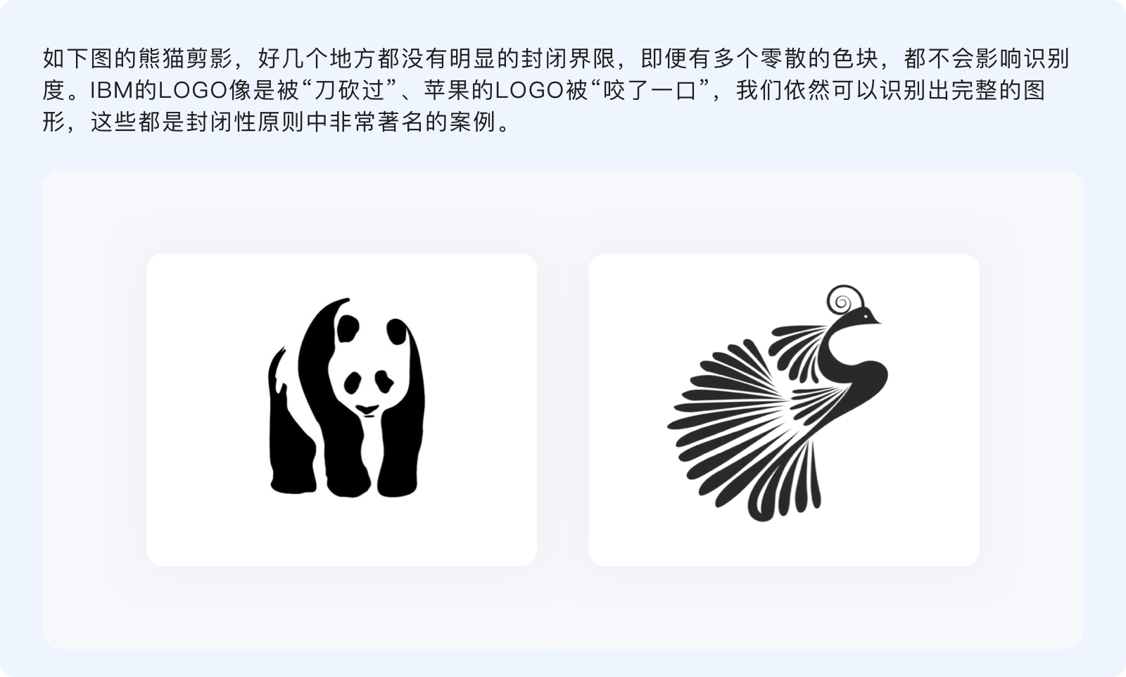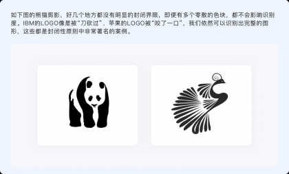 封閉性原則指出,人們的視覺系統(tǒng)傾向于將不完整的局部當(dāng)做一個(gè)整體來(lái)感知??雌饋?lái)與連續(xù)性有諸多相似,不過(guò)連續(xù)性是通過(guò)物體的形狀和運(yùn)動(dòng)方向、按照視覺慣性來(lái)制定閉合規(guī)律,而封閉性則并無(wú)特定規(guī)律,只要把握好不完整物體的尺度、使各元素之間相互輔助,就能讓其與我們認(rèn)知模型中的原型匹配。