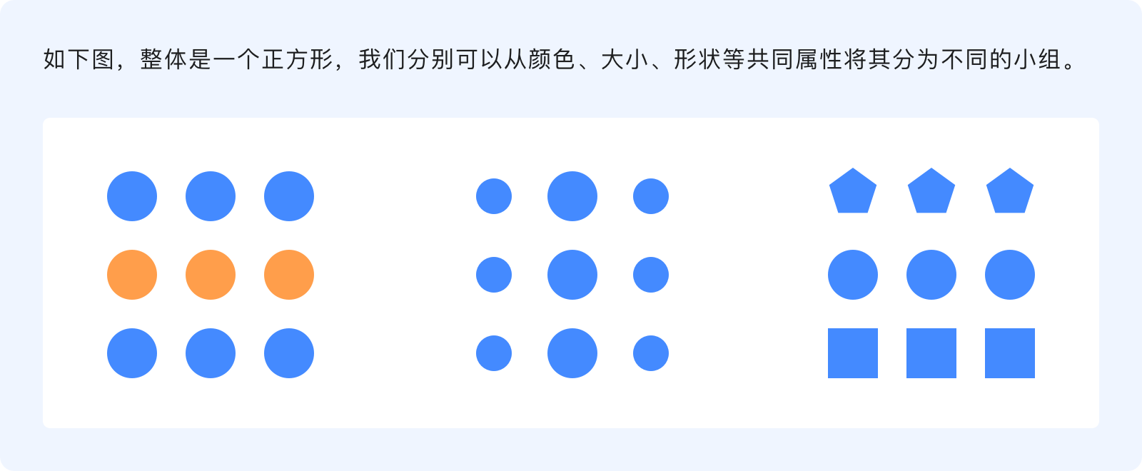 接近性原則指出,物體之間的相對(duì)距離會(huì)影響我們感知它們的關(guān)系,元素之間越是接近,組合在一起的可能性就越大,會(huì)被看作成一個(gè)整體,反之那些距離較遠(yuǎn)的則自動(dòng)劃分到組外。
