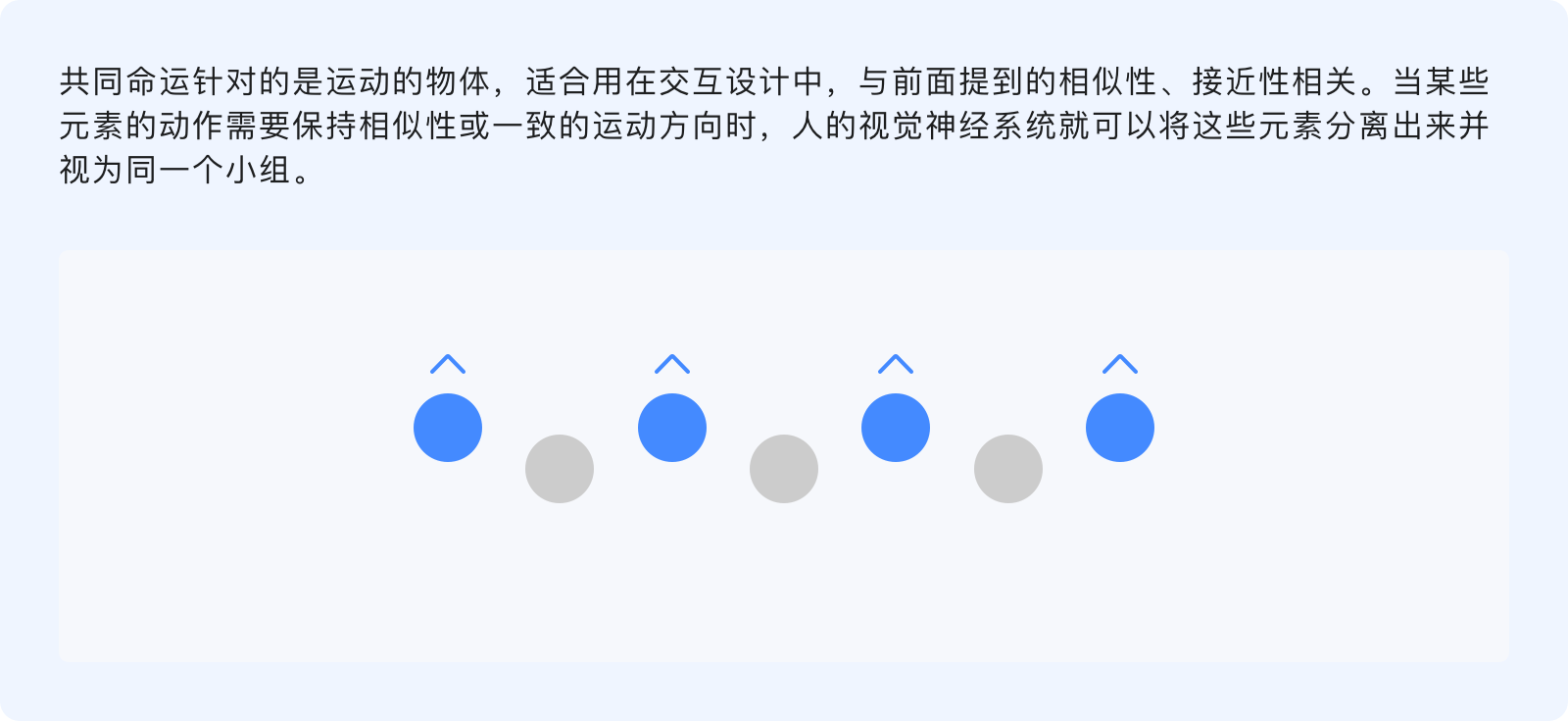共同命運(yùn)原則指出,人們傾向于將具有共同運(yùn)動(dòng)形式的事物感知為一個(gè)彼此相關(guān)的整體,無(wú)論元素之間的距離有多遠(yuǎn)、或其他屬性(形狀、顏色、大?。└鳟悾灰刂嗤姆较?、相同的速度運(yùn)動(dòng),共同命運(yùn)就會(huì)將其歸類。