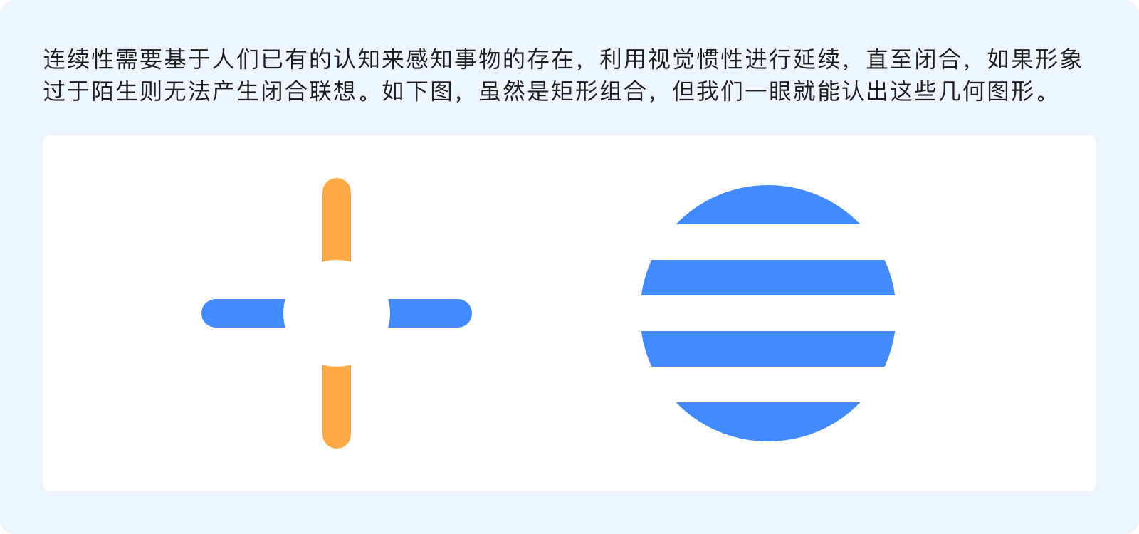 連續(xù)性原則指出,人的視覺傾向于完整的連接一個(gè)圖形,而不是零散的碎片,通過(guò)感知事物的形狀和運(yùn)動(dòng)方向?qū)⒎稚⒌脑剡B接在一起,使直線繼續(xù)成為直線、曲線繼續(xù)成為曲線并朝著特定的方向延續(xù)。