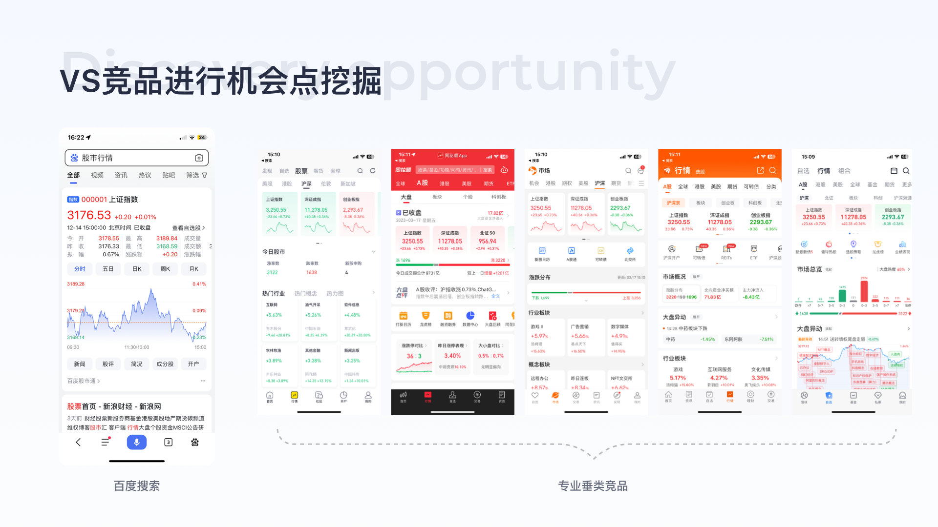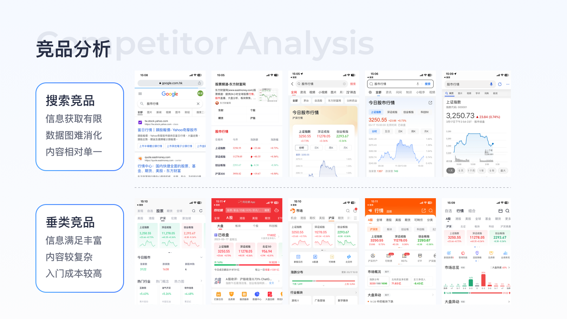 3)內(nèi)容布局及樣式上相對單一:由于滿足卡片使用了通用的股票行情設(shè)計模板、且需求滿足有缺失,導致了內(nèi)容及布局上相對單一,與競品相比在內(nèi)容豐富度及視覺樣式上差距較大。
