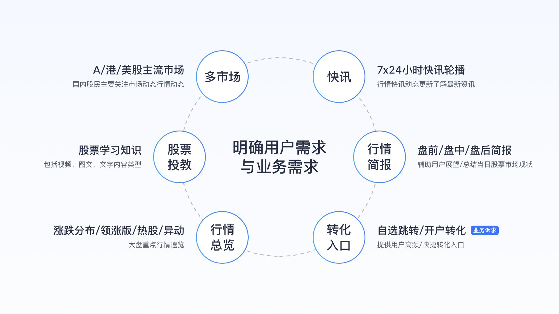 用戶需求:結(jié)合用戶高頻使用功能分析發(fā)現(xiàn)小白用戶、一般散戶、專業(yè)用戶均對行情功能有高頻率的使用需求,具體需求包括了解多市場、關(guān)鍵指數(shù)行情、了解最新快訊、重要行情動態(tài)、盤前/盤中/盤后簡報,再結(jié)合小白用戶占比高且對百科內(nèi)容有需求的現(xiàn)狀,知識科普信息也是相關(guān)待滿足需求。