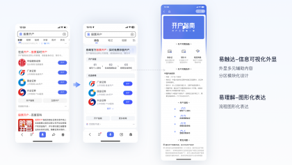 競品分析:搜索競品包括今日頭條、夸克、QQ瀏覽器、必應(yīng)、谷歌均以滿足用戶查找需求為主,信息以純文本形式展現(xiàn),消費成本較高,且未滿足用戶潛在的開戶需求,垂類競品開戶頁對流程、材料介紹均不完整、缺少完整的介紹及問題解答。
