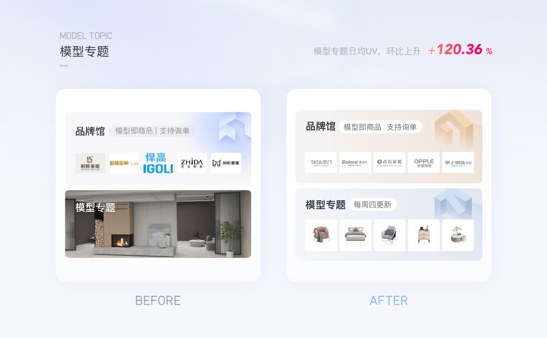 群核下的設(shè)計工具,以專題化的形式聚類商家、平臺推薦的模型是基本的運(yùn)營動作,如下圖,原本以真實效果圖的方式展示模型專題,用戶難以感知是方案還是模型。通過封面圖形的優(yōu)化:將核心的模型類型展示出來,用戶能夠預(yù)見里面的內(nèi)容。