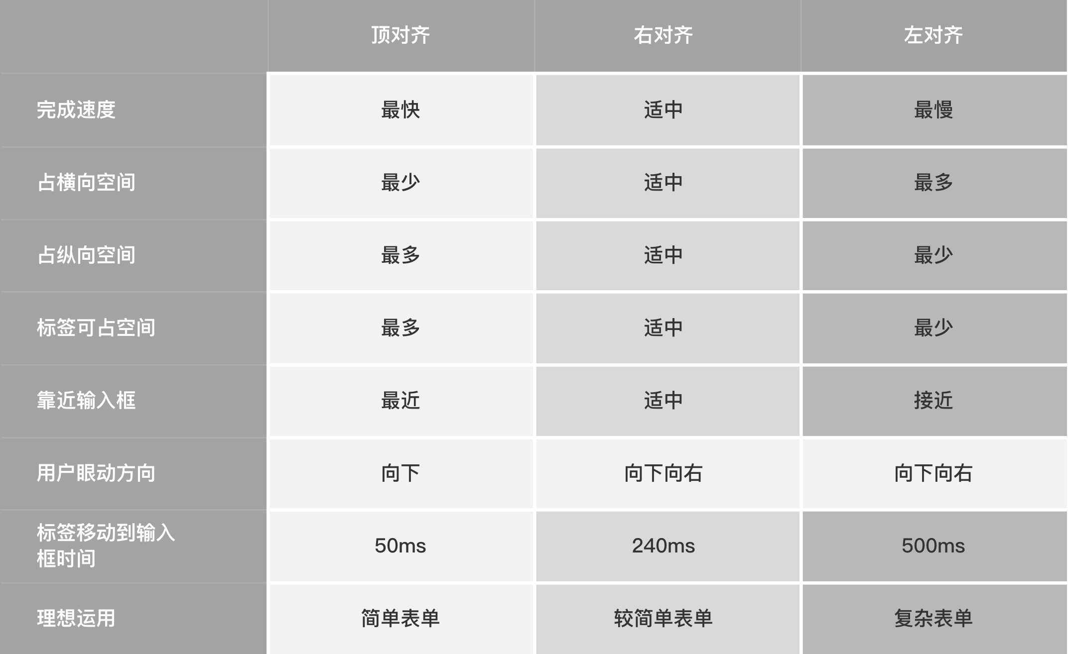 在設(shè)計(jì)表單時(shí)到底是左對(duì)齊、右對(duì)齊還是頂部對(duì)齊呢?這個(gè)問題也是在實(shí)際業(yè)務(wù)中設(shè)計(jì)師發(fā)問頻率較高的一個(gè)棘手問題。其實(shí),不論是哪種方式都有相對(duì)的利弊,需要根據(jù)實(shí)際業(yè)務(wù)場景提供不同的解決方案。在Matteo Penzo《Label Placement in Forms》文章中有分享過關(guān)于表單標(biāo)簽放置的研究,下圖是Matteo Penzo研究總結(jié)得到的瀏覽時(shí)間表: