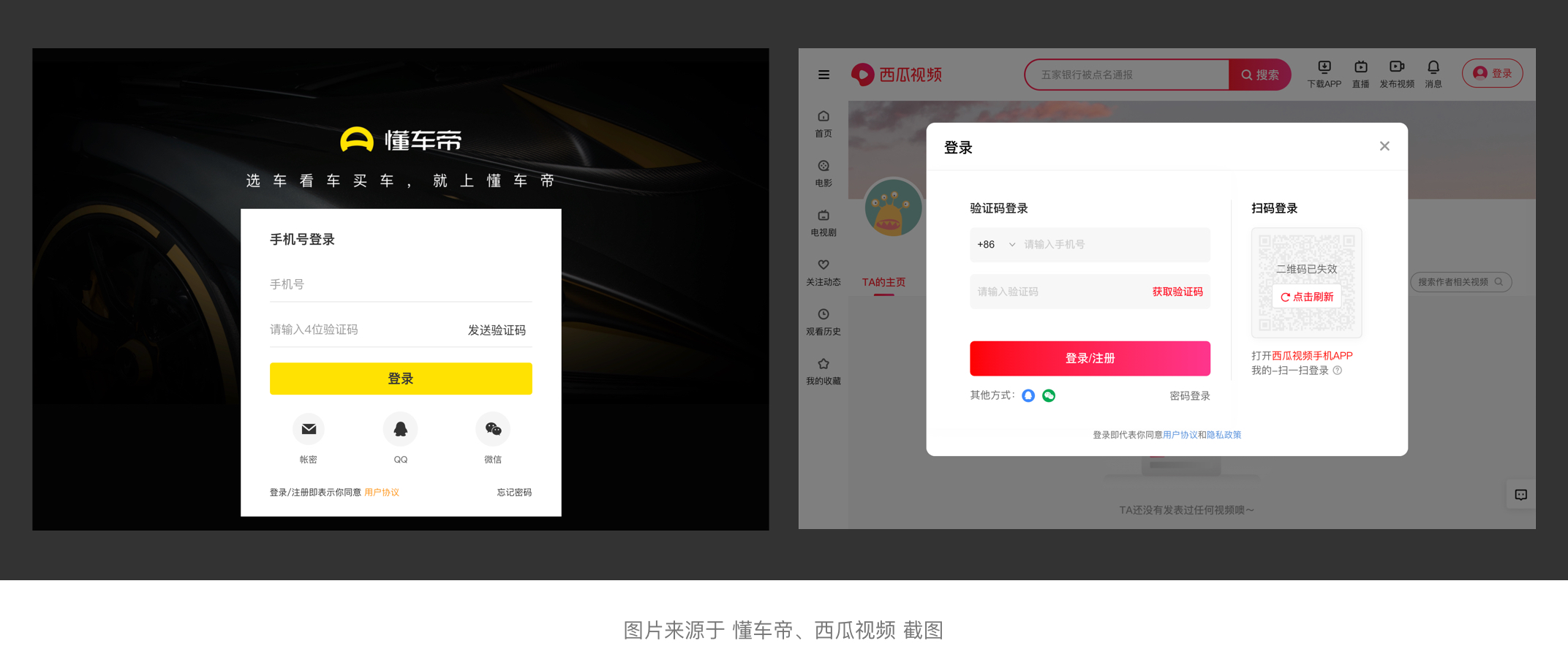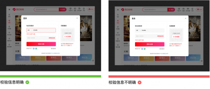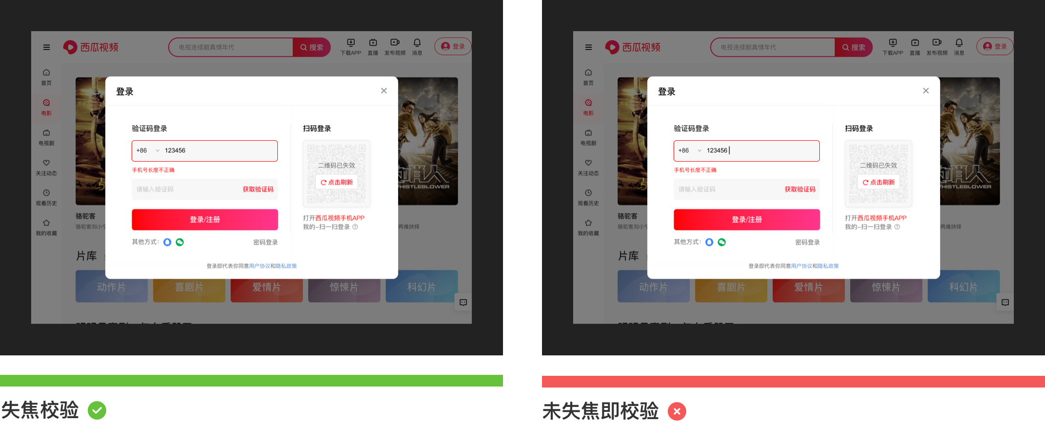 為了避免用戶在提交時(shí)表單時(shí)出現(xiàn)大面積的報(bào)錯(cuò)問題,設(shè)計(jì)師可以使用實(shí)時(shí)校驗(yàn)的交互形式。如:在用戶輸入完成之后鼠標(biāo)失焦后進(jìn)行信息校驗(yàn),但是需要注意的是在實(shí)時(shí)校驗(yàn)時(shí)避免用戶還沒有輸入完成即出現(xiàn)校驗(yàn)誤導(dǎo)用戶,所以需要準(zhǔn)確判斷鼠標(biāo)是否失焦。如下圖所示為西瓜視頻登錄注冊(cè)場景下的截圖: