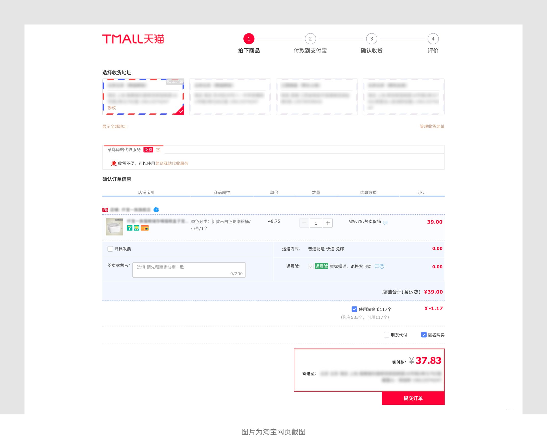 我們以淘寶來舉個(gè)典型的例子,淘寶屬于國民電商平臺(tái)也是亞洲較大的網(wǎng)上交易平臺(tái),提供各類優(yōu)質(zhì)商品。從平臺(tái)的特性來講,它以用戶下單并成交作為最終目標(biāo)。其中支付表單起著一個(gè)關(guān)鍵的作用,用戶從購買到支付完成以分步形式進(jìn)行,第一步填寫基本信息并提交訂單,第二步選擇商品并選擇支付貨款至第三方,第三步買方確認(rèn)收貨并自動(dòng)打款給商家,第四步完成訂單并評(píng)價(jià)。在填寫表單時(shí)中間沒任何阻斷,用戶能很順利的按步驟完成訂單。淘寶支付表單屬于比較典型的分步表單。