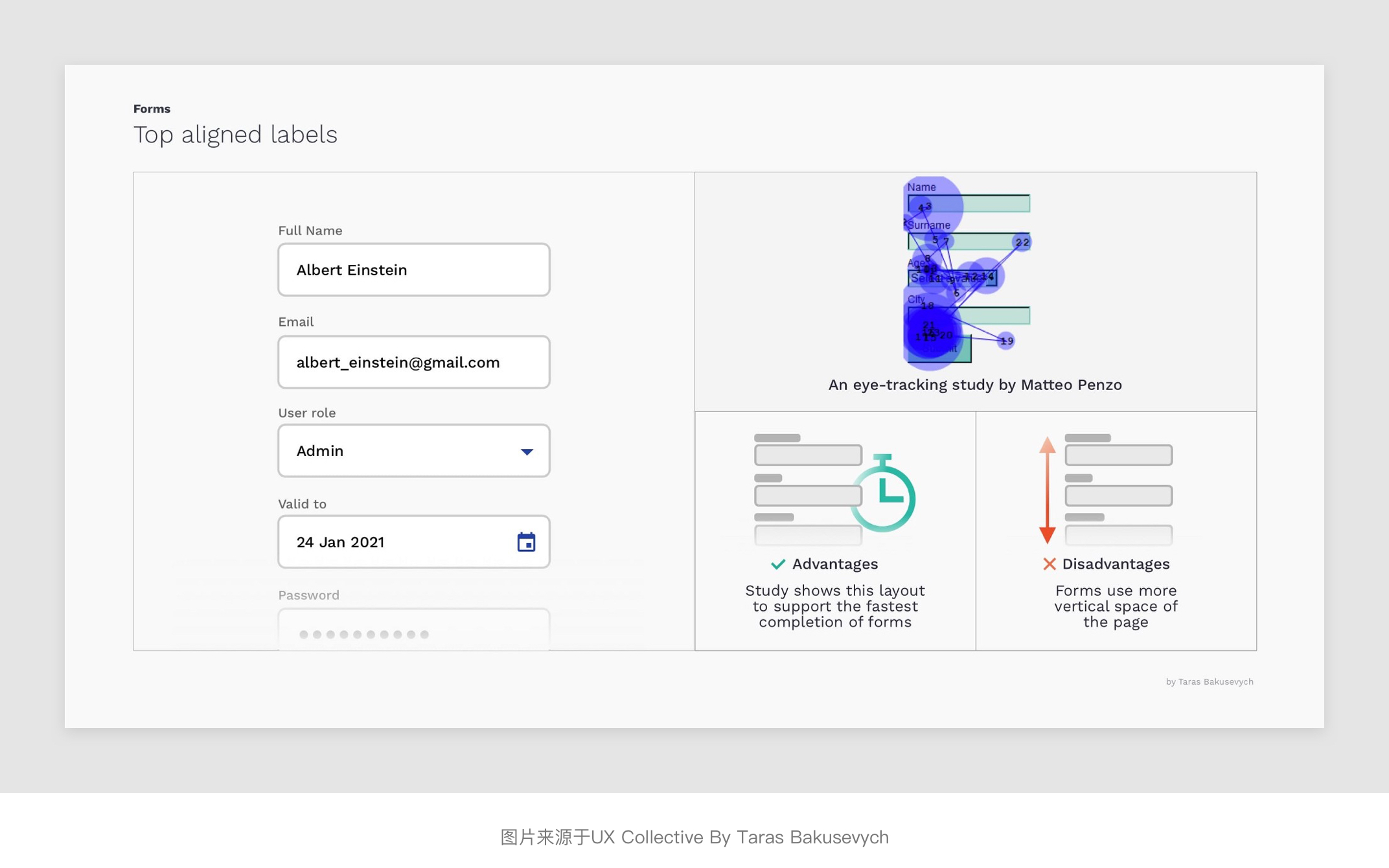 將表單標(biāo)簽放置在其對(duì)應(yīng)輸入字段的正上方,并垂直左對(duì)齊排列,用戶只需依次向下瀏覽即可看到標(biāo)簽與輸入字段兩個(gè)元素。其優(yōu)勢(shì)是橫向屏幕空間足夠,能夠比較友好的適配多語言適合非中國區(qū)業(yè)務(wù)表單使用。并且根據(jù)上面Matteo Penzo的時(shí)間表上看,頂部對(duì)齊的瀏覽和填寫的效率也是3種常規(guī)的對(duì)齊方式中較高的一種。不足點(diǎn)是會(huì)占用較多的縱向垂直屏幕空間,此外應(yīng)當(dāng)注意每組表單標(biāo)簽和輸入字段與其他字段組的間距,以免層級(jí)區(qū)分度不夠的問題。