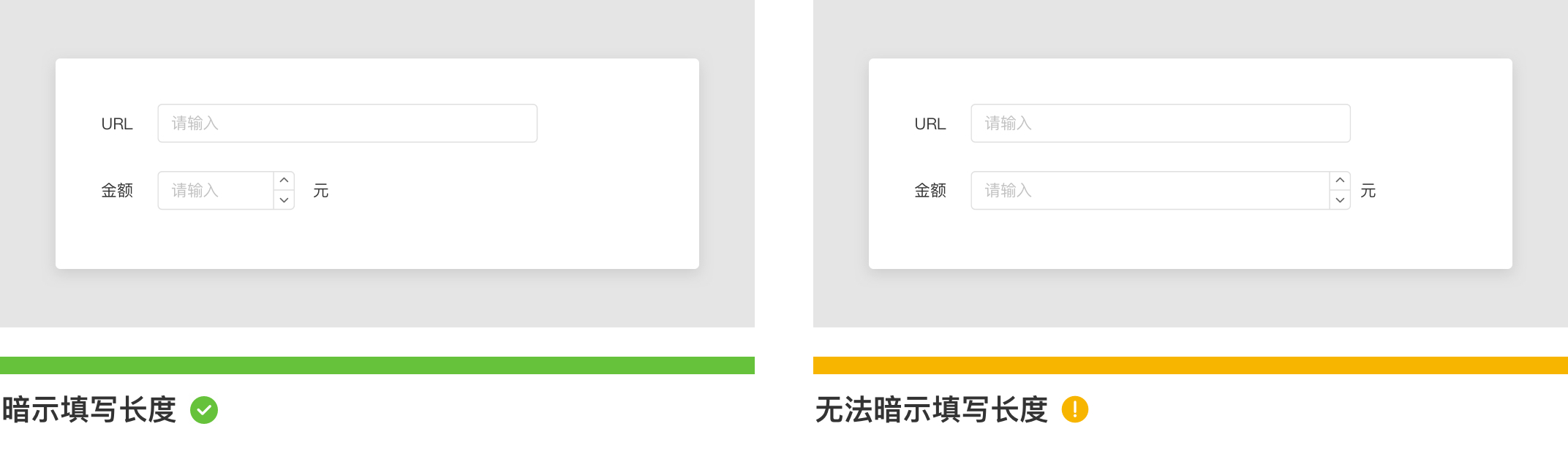 在實(shí)際業(yè)務(wù)中,設(shè)計(jì)師常常習(xí)慣把每個(gè)表單字段都設(shè)置成相同的寬度,在視覺效果上看感覺會(huì)比較統(tǒng)一,但是這種做法實(shí)際上體驗(yàn)欠佳。字段的寬度應(yīng)該向用戶暗示所需輸入內(nèi)容的長度從而減輕判斷負(fù)擔(dān)。在Ant Design 4.0 系列分享的文章《整齊劃一?不如錯(cuò)落有致》中分析到錯(cuò)落有致的排版表現(xiàn)似乎比整齊劃一的左圖更舒適,因?yàn)樵谝曈X上我們更容易將右圖的空間和內(nèi)容視為一個(gè)和諧的整體。但左圖過度的對(duì)齊導(dǎo)致暗示隱性的截?cái)?,我們慣性視覺會(huì)產(chǎn)生表單字段右側(cè)空間缺了一大塊的錯(cuò)覺。
