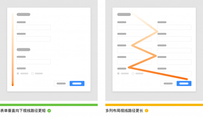 多列表單字段會(huì)導(dǎo)致用戶視覺路徑變長,因?yàn)槿绻韱沃杏兴较噜彽淖侄?,則用戶必須以Z樣式進(jìn)行視線掃描,整體的效率和工作量都更大,使清晰的路徑變得模糊并加長用戶閱讀時(shí)間。多列表單可能會(huì)存在用戶跳過他們實(shí)際要輸入的必填字段,將數(shù)據(jù)輸入到錯(cuò)誤字段中。而最終校驗(yàn)信息時(shí)用戶得反復(fù)檢查錯(cuò)誤項(xiàng)導(dǎo)致用戶放棄填寫。
