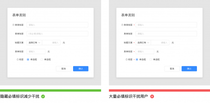 當(dāng)表單中的必填信息多于非必填信息時(shí),如果使用紅色星號(hào)表示必填項(xiàng),那么大量紅色星號(hào)導(dǎo)致增加用戶的認(rèn)知負(fù)擔(dān),使得用戶無法快速識(shí)別哪些是必須填寫的,哪些是不必須填寫。并且使用紅色星號(hào)會(huì)帶給用戶一些恐懼感,它增加了出錯(cuò)的風(fēng)險(xiǎn)并降低了表單填寫率。因此在表單設(shè)計(jì)中,當(dāng)必填項(xiàng)多于非必填項(xiàng)時(shí),隱藏紅色星號(hào)標(biāo)記,通過暗提示標(biāo)記可選項(xiàng)的形式來幫助用戶識(shí)別。