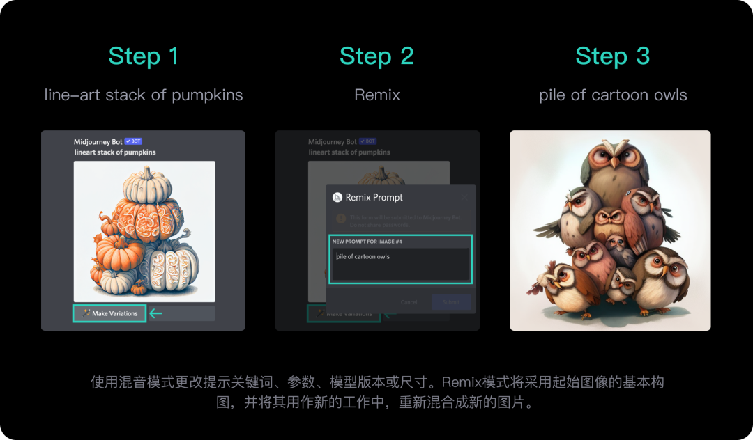 回顧之前《ASAK|全面解析Midjourney參數(shù)和指令》的案例,使用的步驟如下:點(diǎn)擊Make variations,在彈出窗口中修改或輸入新的提示。例如在輸入框里輸入pile of cartoon owls(一堆卡通貓頭鷹)。最終生成的圖片對(duì)應(yīng)的貓頭鷹代替南瓜。