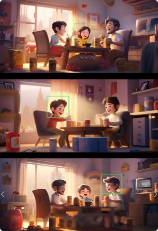 在前期,我們對(duì)構(gòu)想的畫面進(jìn)行關(guān)鍵詞的描述:“可愛帥氣的男女孩子們一起玩手機(jī),開心地微笑著,舉起手歡呼,溫暖的房間,大型落地窗。”將關(guān)鍵詞翻譯后放入Midjourney中進(jìn)行煉圖,最終篩選了幾張氛圍還不錯(cuò)的進(jìn)行下一步操作。