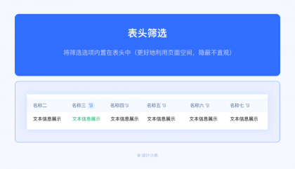 將篩選選項(xiàng)內(nèi)置在表頭中(更好地利用頁(yè)面空間,隱蔽不直觀)。當(dāng)頁(yè)面空間有限時(shí),可以考慮此方案。另外當(dāng)表格表頭字段數(shù)據(jù)較多時(shí),需要橫向滑動(dòng)查看數(shù)據(jù)時(shí),建議還是直接將篩選條件單獨(dú)放在外面。或者當(dāng)需要篩選的選項(xiàng)太多時(shí),表頭字段都能篩選時(shí),也可以考慮放在表頭中。
