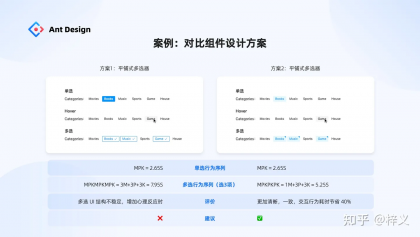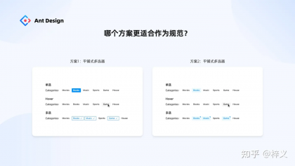 最后一個問題,某設(shè)計系統(tǒng)需要建設(shè)平鋪式多選器這樣一類組件,我們有兩位設(shè)計師出了兩套方案,請問哪個方案更適合作為規(guī)范納入到設(shè)計系統(tǒng)當中呢?