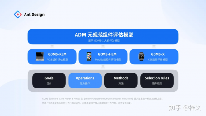 ADM 元規(guī)范的組件評估模式正式基于 GOMS 人機交互模型演變而來。GOMS 是 1983 年 Card 等人在《The Psychology of Huamn Computer Interaction》首次提出的一種交互建模方法,它的核心理念是將用戶與界面交互行為拆解為行為元動作,無需真實用戶介入就能預(yù)測交互行為的序列,評估交互的質(zhì)量。