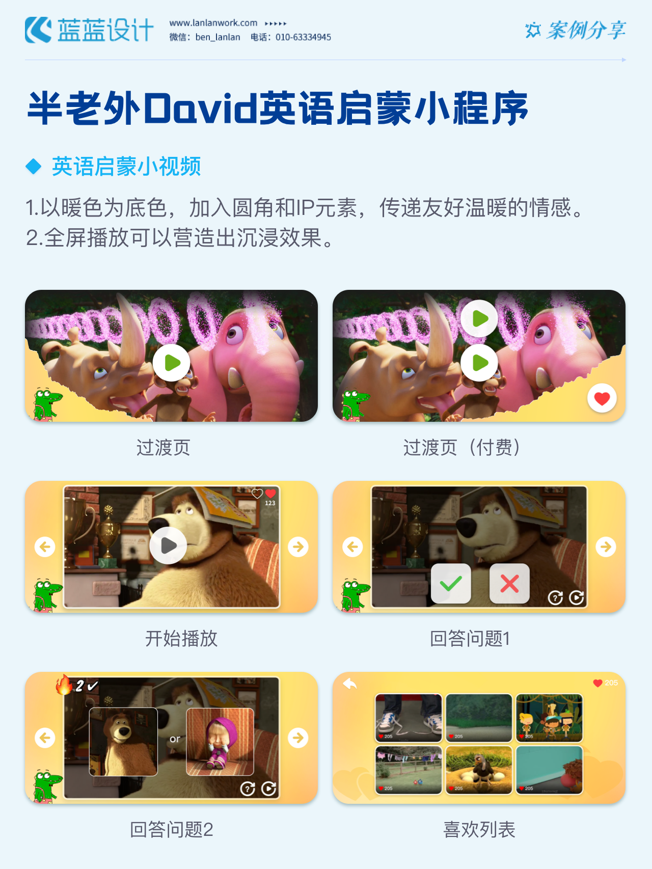 藍藍設計負責半老外David英語啟蒙小程序的界面整體風格和細節(jié)優(yōu)化工作,也包括圖片優(yōu)化等諸多視覺內(nèi)容。前期雙方通過不斷溝通和深入了解最終確定了頁面的風格樣式。看視頻學英語的方式更容易為孩子所接受,頁面的簡潔風格和顏色應用更加吸引兒童。