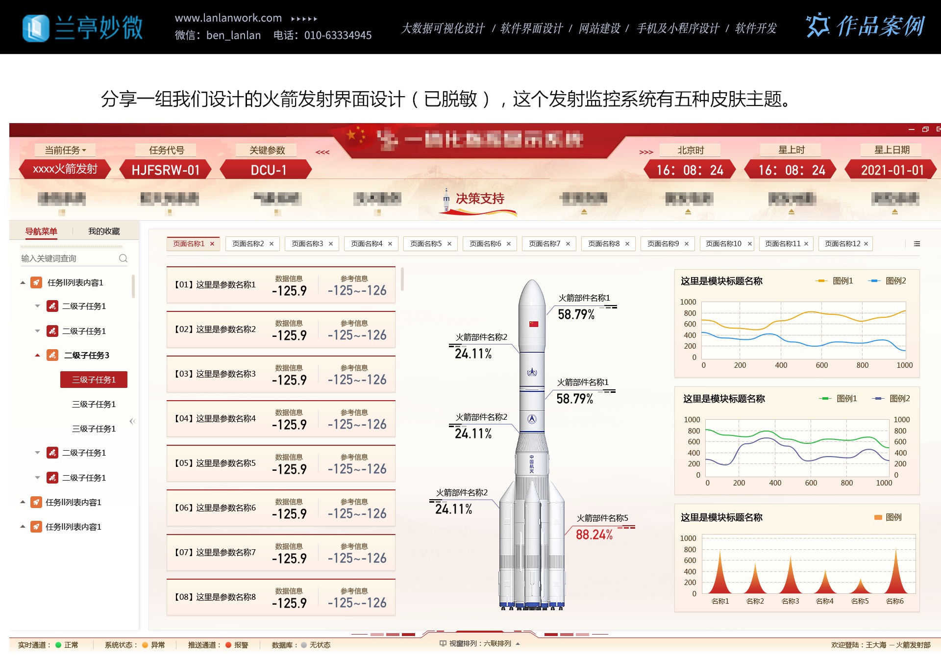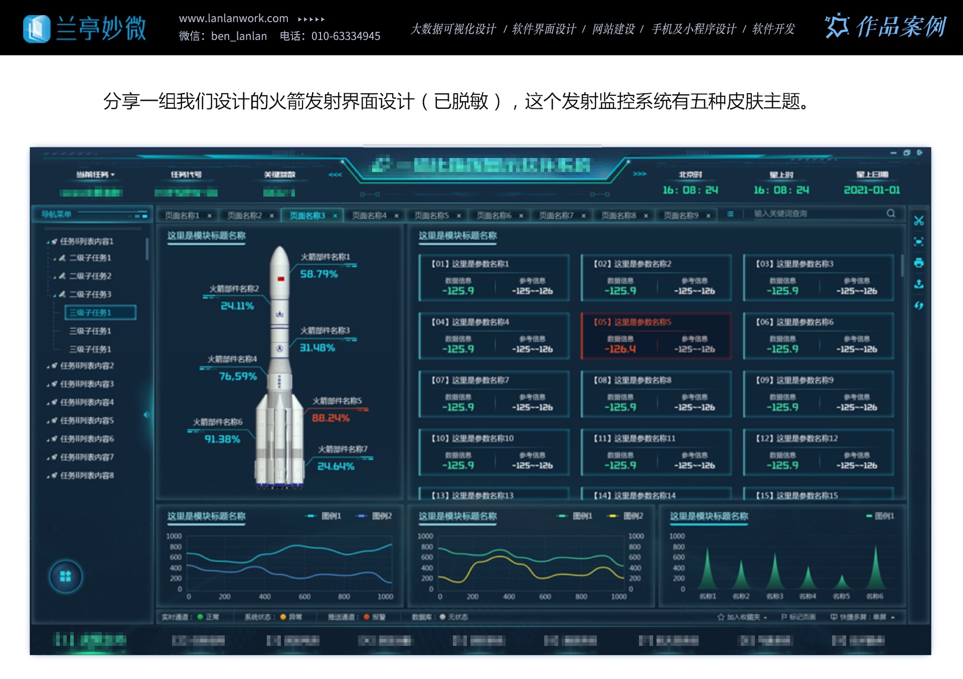 蘭亭妙微的設(shè)計(jì)內(nèi)容廣泛而深入。在戰(zhàn)場(chǎng)態(tài)勢(shì)展示方面,他們運(yùn)用先進(jìn)的可視化技術(shù),將復(fù)雜的戰(zhàn)場(chǎng)信息清晰地呈現(xiàn)給用戶,幫助用戶快速做出決策。在火箭發(fā)射領(lǐng)域,他們?cè)O(shè)計(jì)的界面簡(jiǎn)潔明了,操作流程順暢,確保發(fā)射任務(wù)的順利進(jìn)行。無(wú)人機(jī)、GIS 地圖、信號(hào)源等關(guān)鍵領(lǐng)域也都有他們的精彩設(shè)計(jì)。從交互原型設(shè)計(jì)到視覺風(fēng)格打造,從功能布局重塑到多維表格應(yīng)用,從 Qt 開發(fā)到 VR 仿真實(shí)訓(xùn),蘭亭妙微全方位服務(wù)于航天軍工產(chǎn)品,為企業(yè)提供一站式的 UI 設(shè)計(jì)解決方案。