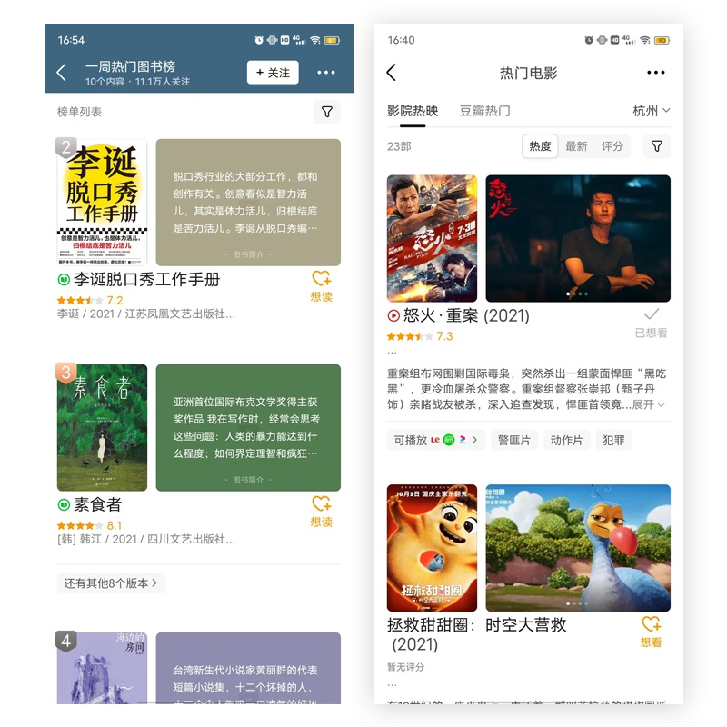 豆瓣的電影榜單設(shè)計(jì)非常巧妙:豎幅圖片完美展示電影海報(bào),橫幅區(qū)域則用于劇照輪播。這種豎橫搭配不僅視覺和諧,還能比單圖展示更高效地利用空間。這個(gè)設(shè)計(jì)模式同樣適用于圖書榜單,橫幅區(qū)域可以展示書評。通過呈現(xiàn)豐富的信息,用戶能在列表頁就對內(nèi)容有更全面的了解,從而提高查看詳情頁的意愿。