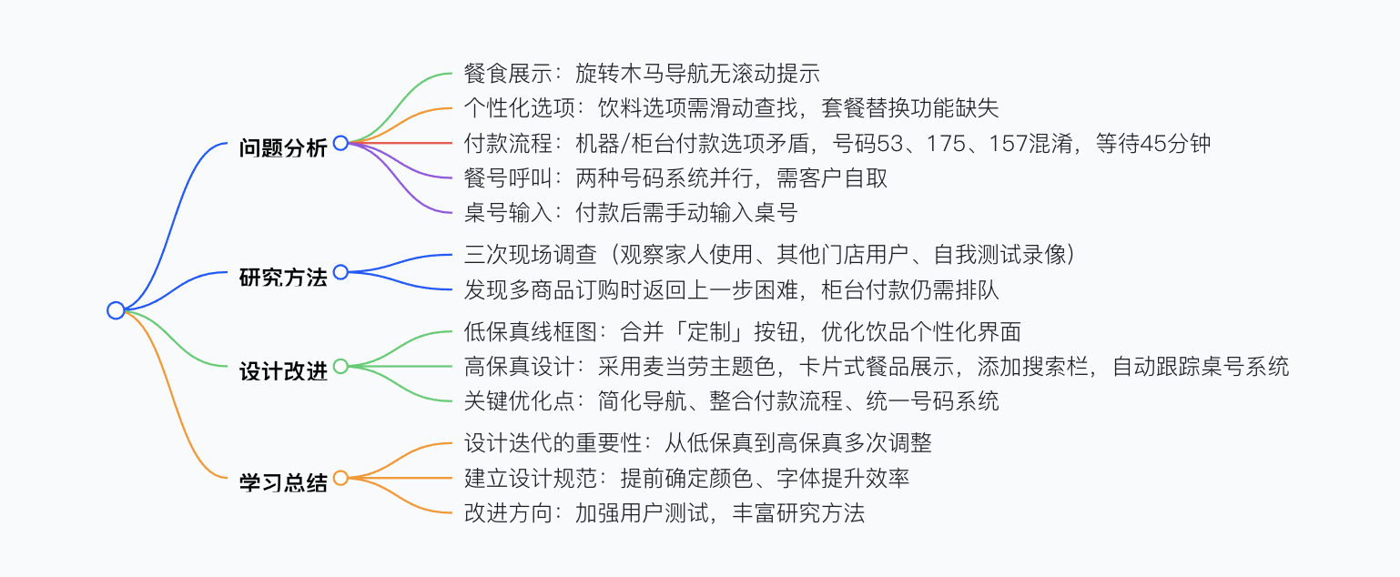 本文圍繞麥當(dāng)勞自動(dòng)點(diǎn)餐系統(tǒng)的用戶體驗(yàn)展開(kāi)分析,指出其在餐食展示(無(wú)滾動(dòng)提示)、個(gè)性化選項(xiàng)(需手動(dòng)滑動(dòng)才能看到更多)、付款流程(存在 53、175、157 三個(gè)混淆號(hào)碼,導(dǎo)致 45 分鐘等待)、餐號(hào)呼叫系統(tǒng)(兩種號(hào)碼并行)、桌號(hào)輸入等環(huán)節(jié)存在問(wèn)題。作者通過(guò)三次現(xiàn)場(chǎng)調(diào)查,基于用戶畫像和故事板構(gòu)建解決方案,經(jīng)低保真與高保真原型迭代,重新設(shè)計(jì)了菜單展示、個(gè)性化選項(xiàng)流程及付款系統(tǒng),最終強(qiáng)調(diào)設(shè)計(jì)中反復(fù)測(cè)試和建立規(guī)范的重要性。