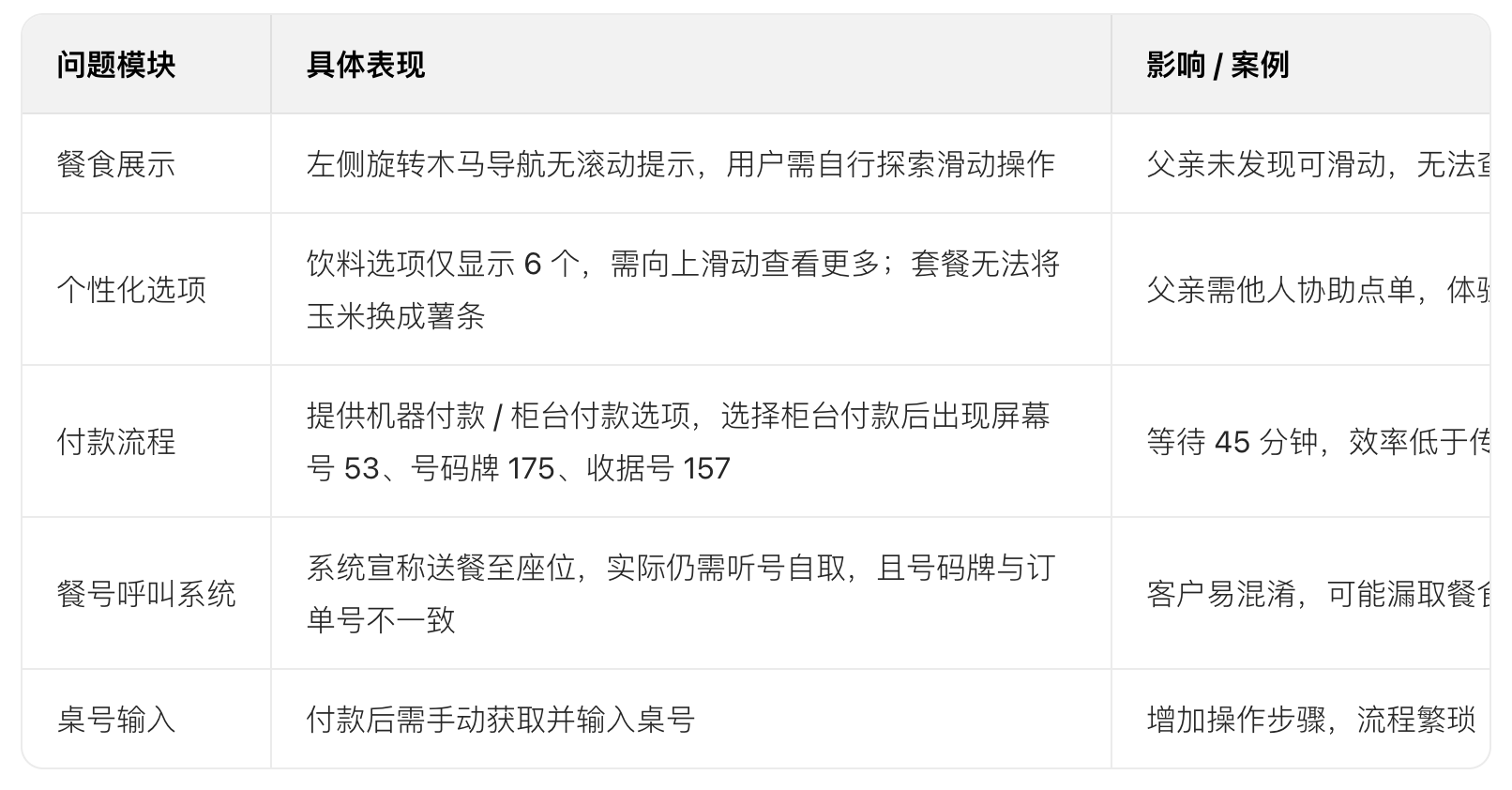 答案:付款選項(xiàng)設(shè)置矛盾(機(jī)器付款與柜臺(tái)付款并存),且選擇柜臺(tái)付款后出現(xiàn)三種號(hào)碼(屏幕號(hào) 53、號(hào)碼牌 175、收據(jù)號(hào) 157),導(dǎo)致用戶等待 45 分鐘,遠(yuǎn)超快餐行業(yè)常規(guī)等待時(shí)間。
