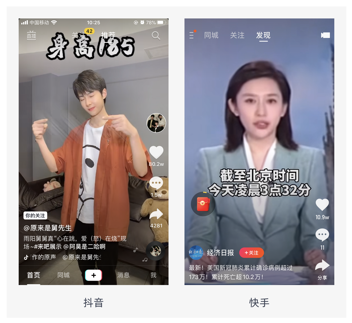 視頻性 Feed 流以短視頻為主(長(zhǎng)視頻占用用戶時(shí)間長(zhǎng),容易導(dǎo)致用戶缺乏耐心),搭配輔助文字。它的優(yōu)點(diǎn)是能滿足用戶在視覺(jué)和聽(tīng)覺(jué)上的感受,沉浸式體驗(yàn)好,更加容易吸引用戶的注意力,一般情況下會(huì)主動(dòng)且循環(huán)播放,畫(huà)面占滿全屏,如快手、抖音、微視等。不過(guò),它也存在缺點(diǎn),占用空間大,展示內(nèi)容少,而且需要緩存,對(duì)網(wǎng)絡(luò)質(zhì)量要求高。