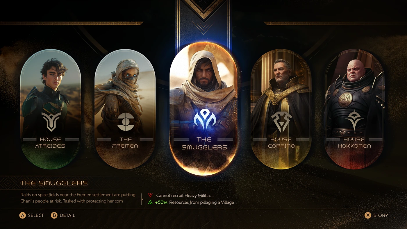 《沙丘》的世界觀強(qiáng)調(diào)沙漠、貴族與荒涼感,UI 也延續(xù)了這一氛圍: