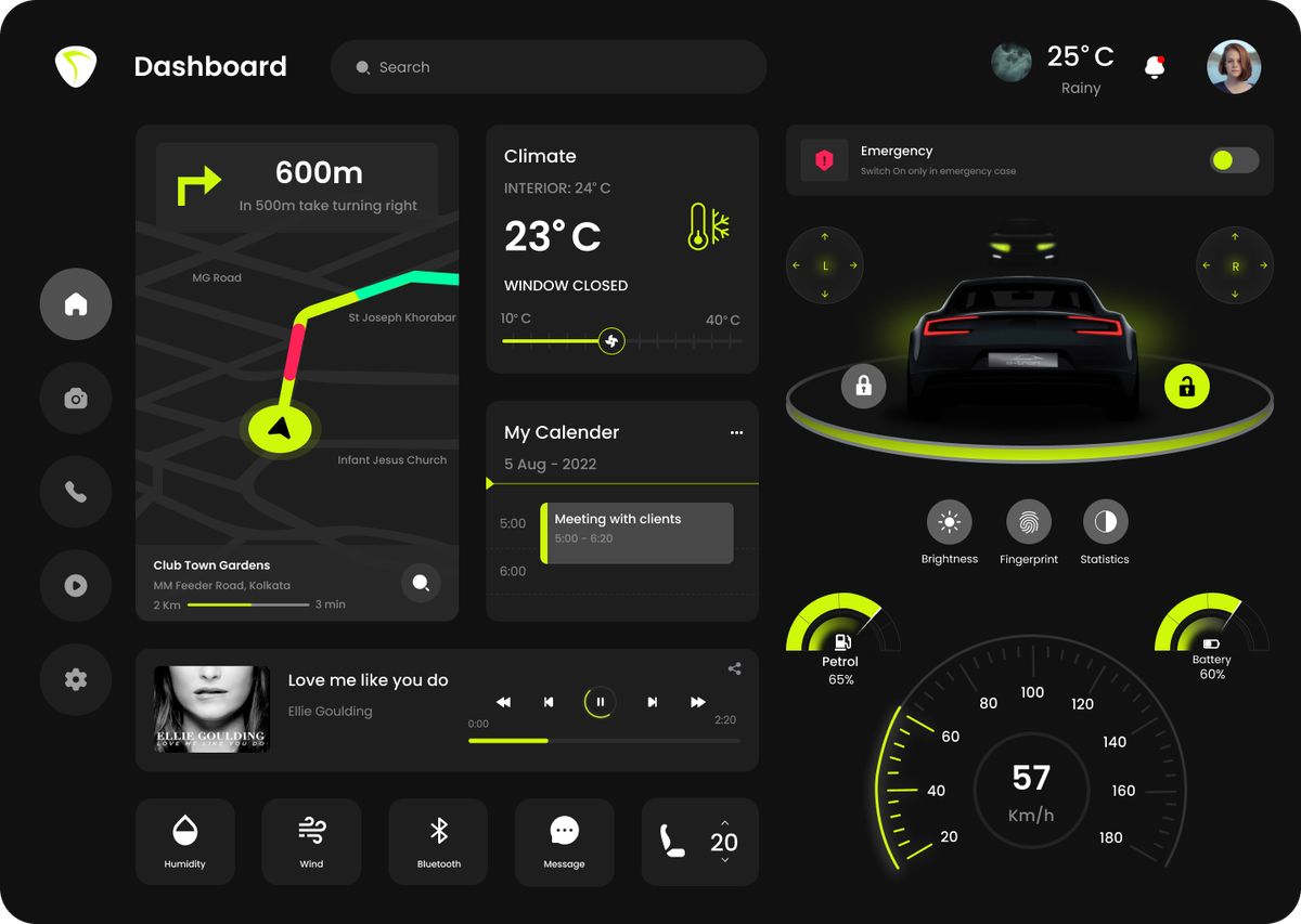 汽車中控是用戶出行的高頻交互場景,設(shè)計(jì)不僅要 “能用”,更要 “好用且愉悅”。這類界面將導(dǎo)航、車況、娛樂等功能整合,深色主題搭配熒光黃交互元素,既避免強(qiáng)光干擾駕駛,又讓操作區(qū)清晰可辨。實(shí)時(shí)路況、車輛能耗的直觀展示,音樂播放的便捷控制,都圍繞 “駕駛場景下的高效交互” 展開。這和我們的設(shè)計(jì)理念不謀而合 —— 科技產(chǎn)品的 UI,應(yīng)模糊 “工具” 與 “伙伴” 的邊界,讓每一次使用都成為舒適的體驗(yàn)。