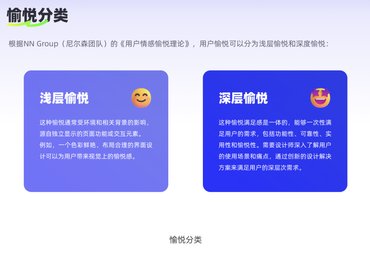 根據(jù)尼爾森團(tuán)隊(duì)的《用戶情感愉悅理論》,設(shè)計帶來的愉悅感分為兩種,二者的價值和實(shí)現(xiàn)方式截然不同,混淆它們很容易讓設(shè)計 “浮于表面”。