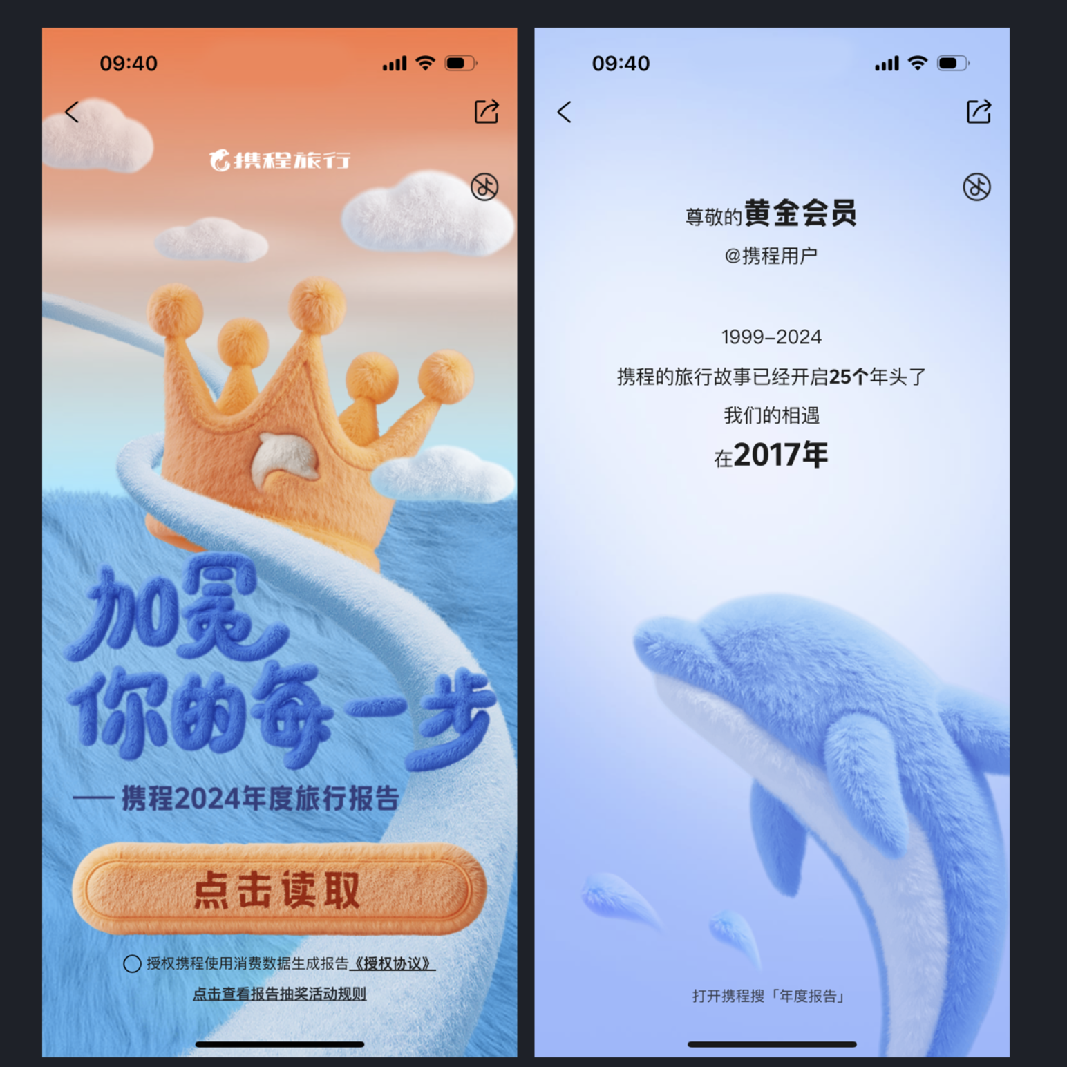年度報(bào)告已成產(chǎn)品標(biāo)配,但想要讓人印象深刻,風(fēng)格化表達(dá)是關(guān)鍵。攜程旅行 2024 年度旅行報(bào)告以毛茸茸的設(shè)計(jì)語(yǔ)言,讓圖標(biāo)、字體、按鈕都透著柔軟質(zhì)感,在寒冬中給用戶帶來(lái)溫暖體驗(yàn)。報(bào)告不僅呈現(xiàn)出行數(shù)據(jù),更通過 "加冕你的每一步" 的情感化文案,讓用戶在回顧旅程時(shí)收獲成就感,這種情感與風(fēng)格的雙重共鳴,讓分享欲自然提升。