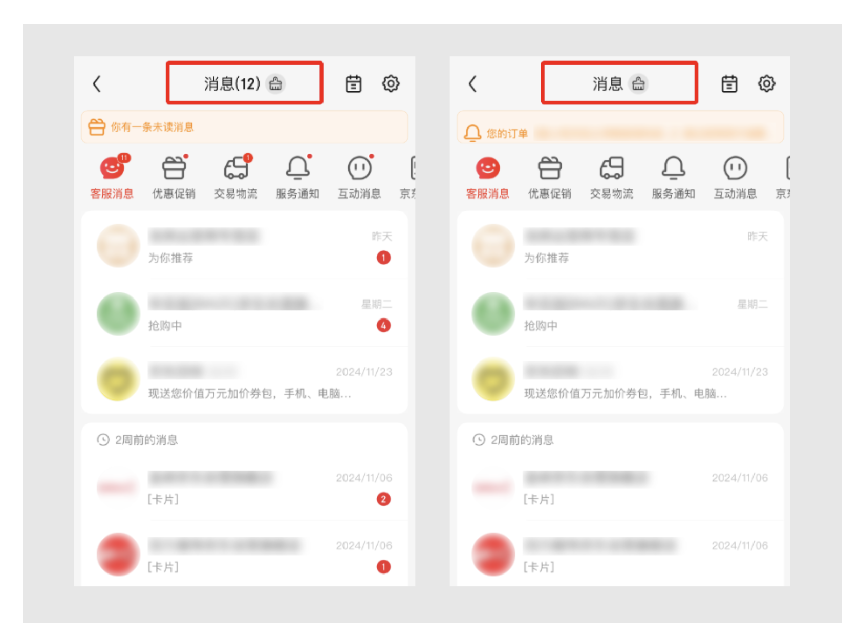 • 消費(fèi)相關(guān)消息(客服對話、系統(tǒng)通知)單獨(dú)設(shè)置 **「全部已讀」** 按鈕,置于各分類的頂部,支持精準(zhǔn)清理;