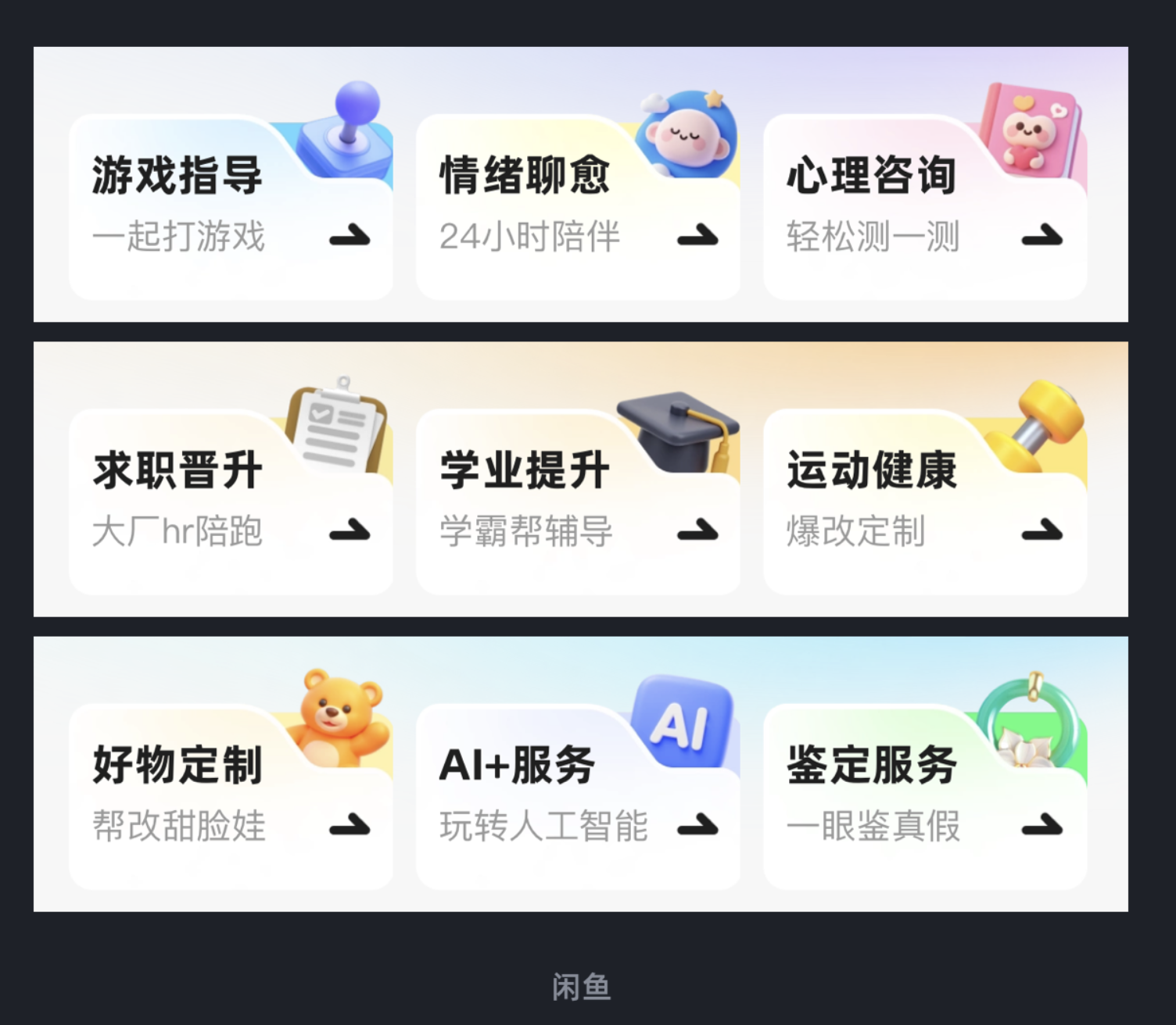 閑魚副業(yè)欄目的設(shè)計將這一點(diǎn)發(fā)揮得淋漓盡致,首先讓卡片一角做凹陷的異形處理,把功能圖標(biāo)精準(zhǔn)嵌入凹陷區(qū)域,形成 “卡片 - 圖標(biāo)” 的貼合感;再通過背景卡片的色彩與層級襯托,讓整組設(shè)計形成多層疊加的視覺效果。異形卡片打破了常規(guī)的規(guī)整感,圖標(biāo)與凹陷的結(jié)合讓元素布局更巧妙,多層結(jié)構(gòu)則進(jìn)一步強(qiáng)化了模塊區(qū)分,讓整個界面既富有設(shè)計感,又能讓用戶快速識別不同功能模塊。
