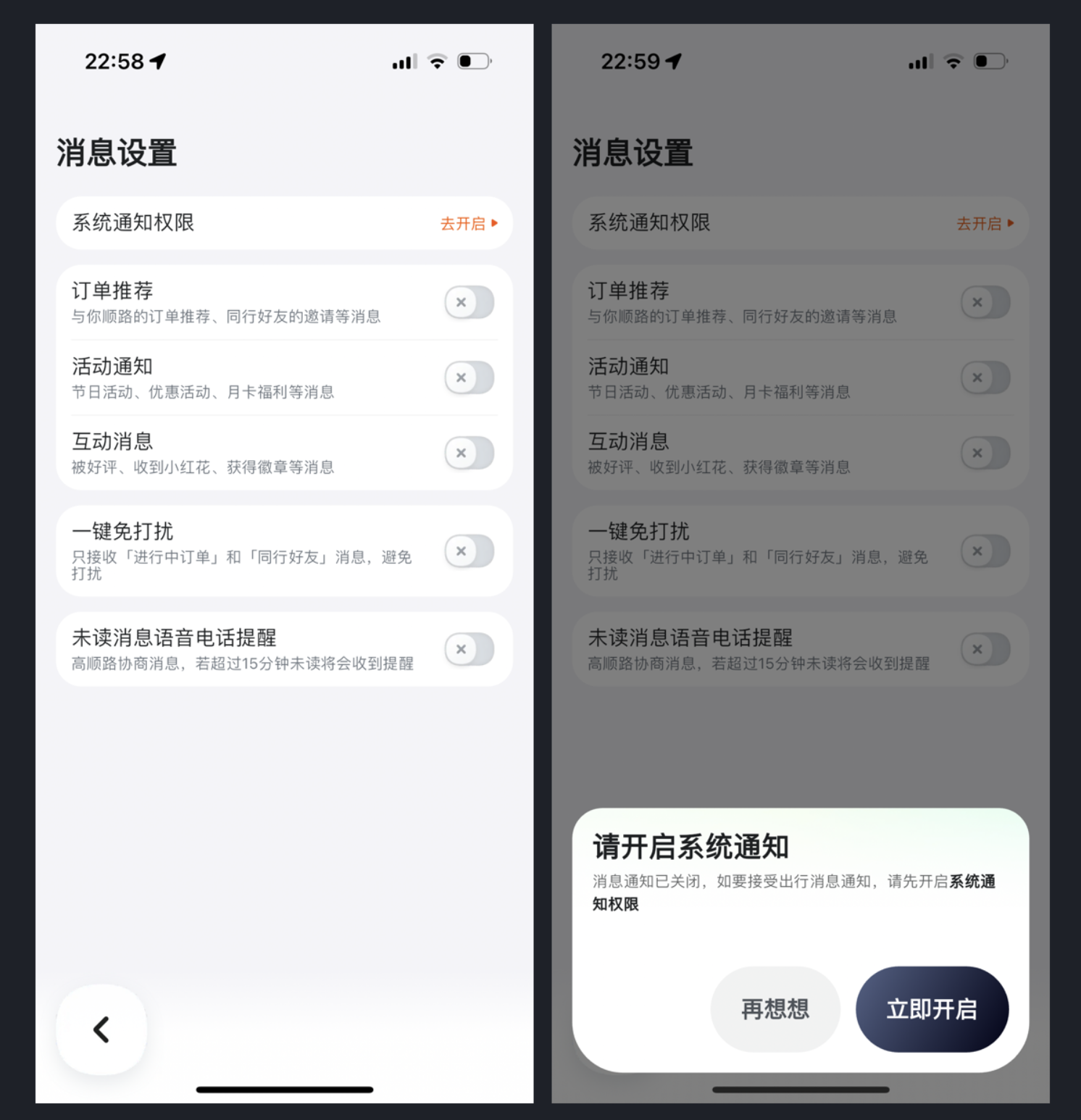 嘀嗒出行的消息設(shè)置設(shè)計就極具人性化,它沒有刻意弱化關(guān)閉按鈕,反而讓操作更直觀;同時為了避免消息過度干擾,特意設(shè)計了 “一鍵免打擾” 功能,讓用戶可自主選擇僅接收核心消息。這種設(shè)計摒棄了 “單向引導(dǎo)” 的思維,而是賦予用戶選擇權(quán),既實(shí)現(xiàn)了引導(dǎo)開啟通知的核心目的,又兼顧了用戶的使用體驗(yàn),讓交互設(shè)計更有溫度。