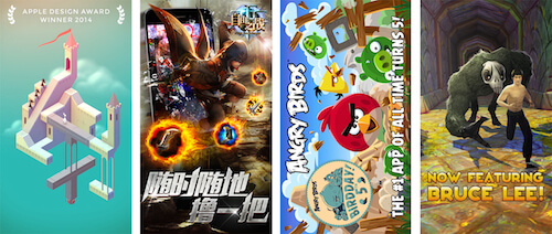 對游戲應用來說,你的主要目標是調(diào)動起用戶的情緒(而不是展示功能)。選擇游戲中史詩般的場景和驚心動魄的畫面去凸顯游戲的樂趣。讓用戶在安裝這個app以前就能夠所感受到快樂的預感;用標題講故事,通過展示徽章和獎勵來吸引玩家。