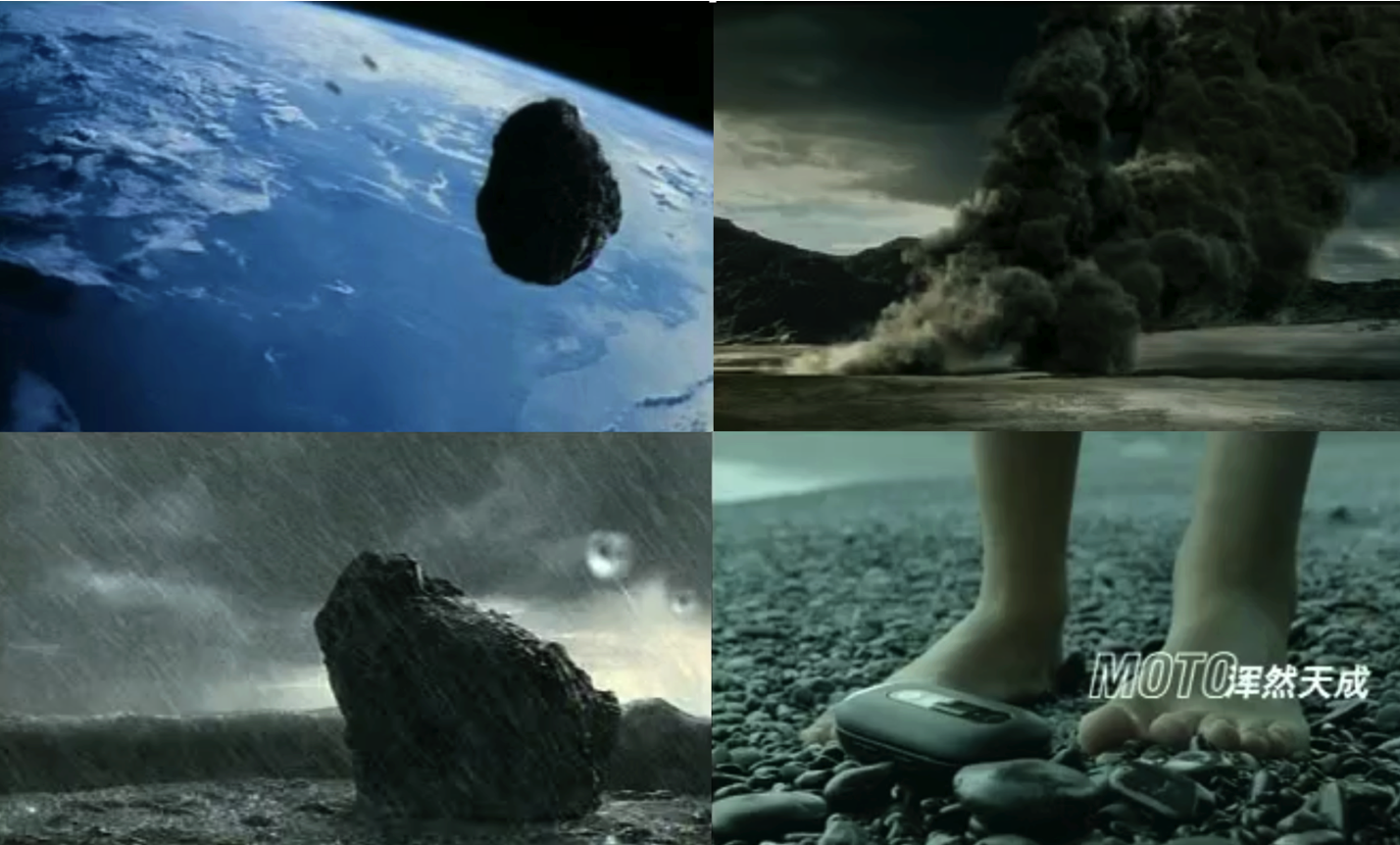 想到這里,我記得個人非常喜歡MOTO的一款手機U6,它的廣告也同樣精彩:一塊太空隕石轟然墜落大氣層,歷經(jīng)風(fēng)吹日曬、雨雪凌虐,在歲月洗禮中,滄海桑田,最后成為沙灘上一顆圓滑的黑色鵝卵石,一個美女撿起打開,聲音響起:Hello Moto!