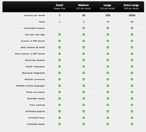 看一下Invoice Machine的例子,表格里除了最上面的三種功能,其他功能的四個條目項都一樣。該表格因此增加了沒有必要的15行。解決方法可以通過一個簡單的公告列表說明“我們的計劃都包括以下功能”,用戶能夠快速看到,他們無論選擇哪個計劃,都會具備這些功能。表格只需要縮短成3-4行,用來顯示不同的部分。我再次重申,表格應該讓信息更易讀。如果您的表格不符合這一目標則會適得其反。