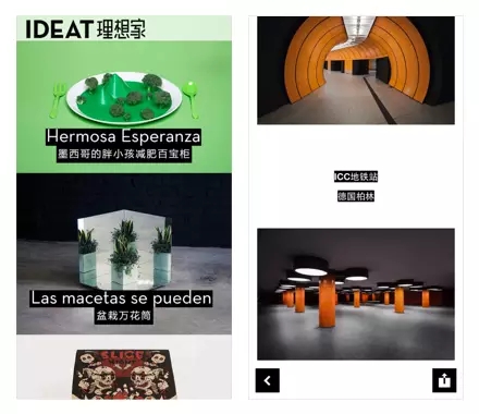 IDEAT理想家App,繼承了法國IDEAT雜志的理念,以展示設(shè)計、藝術(shù)和風(fēng)尚的「當(dāng)代生活」內(nèi)容為主。App界面上除了內(nèi)容圖片之外,幾乎沒有黑白以外的其他色彩元素。通過襯以黑底的高亮白字,既是內(nèi)容又是裝飾,貫穿在整個App設(shè)計元素當(dāng)中;調(diào)節(jié)這些文字與其他內(nèi)容之間的間距,又在排版上起到作為點(diǎn),作為線,甚至作為面的不同功用。