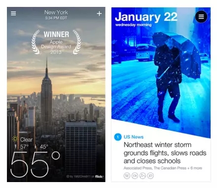 例如以設(shè)計精美著稱的Yahoo的兩款明星App產(chǎn)品Yahoo Weather!和Yahoo Digest。除了在產(chǎn)品設(shè)計上的和突出表現(xiàn)外,模糊和斜切的手法,給整個產(chǎn)品的品牌氣質(zhì)提升到了一個新的高度。 Yahoo Weather! 不論是在布局、字體和色彩的運(yùn)用上都顯得精致細(xì)膩,滑動時高斯模糊的處理更是流暢平滑。Yahoo Digest 的斜切突出一個“破”,在不影響照片內(nèi)容的前提下,既能在視覺上顯得與眾不同,又在排版上巧妙地為色彩標(biāo)簽留了一角之地。比起一刀平,更顯靈動而不失平衡感。
