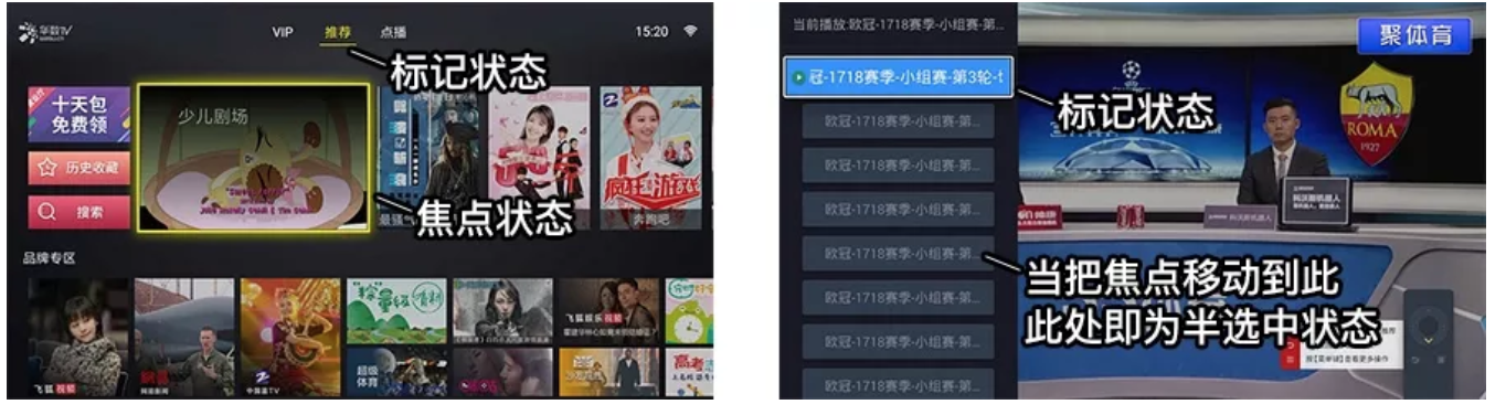 可能需要簡單講述一下“標(biāo)記狀態(tài)”和“半選中狀態(tài)”:“標(biāo)記狀態(tài)”在PC和手機端也非常常見,比如告知用戶所在位置在哪里的Tab標(biāo)記;而“半選中狀態(tài)”是“焦點狀態(tài)”的一種情況,即移動到某個焦點后,不進行加載或觸發(fā)操作,需按“OK鍵”才觸發(fā),如圖15所示。這種狀態(tài)在早期電視盒子性能不足、在Tab切換時經(jīng)常需要使用,因為如果直接切換焦點時就加載,可能會造成卡頓。