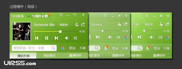 早在2011年7月,QQ音樂2011beta版的發(fā)布便確立了用品牌色–綠色,做為QQ音樂客戶端的默認(rèn)顏色,綠色代表和平、希望、生長和環(huán)保,對(duì)QQ音樂的品牌形象有積極的正面意義,此外,縱觀競品,常見的客戶端配色多為黑和藍(lán),用綠色也較利于提高產(chǎn)品的識(shí)別度。QQ音樂2012賀歲版的視覺,也是圍繞綠色和細(xì)節(jié)進(jìn)行全面的體驗(yàn)優(yōu)化。項(xiàng)目從去年12月31號(hào)開始,進(jìn)行了為期15天的設(shè)計(jì)和快速迭代。