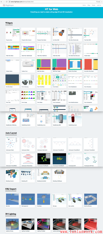 這樣綜合并可搜索的手冊(cè)入口居然還常被問(wèn)及 HT 的 Demo 在哪里?只能怪這些年深入人心的用戶(hù)體驗(yàn)理念,把人慣得包括很多程序員都如此之“懶”,當(dāng)然也怪我們沒(méi)把用戶(hù)體驗(yàn)的最后一公里做到位,于是最近 wangyinlong 同學(xué)人工例子抓圖,將數(shù)百個(gè)手冊(cè)例子進(jìn)行了歸類(lèi)整理,最終形成了方便大家直觀查找所有 HT 例子的頁(yè)面:http://www.hightopo.com/demos...