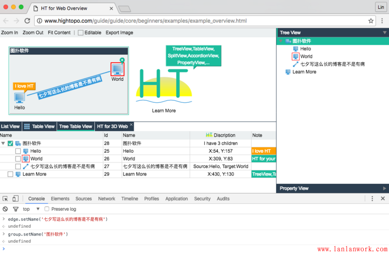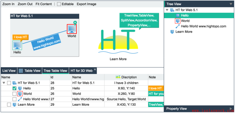 這個(gè)例子增加了設(shè)置父子關(guān)系的代碼,同時(shí)有更多的組件(拓?fù)鋱D、屬性頁(yè)、列表、樹(shù)、表格、樹(shù)表組件)綁定了同一個(gè)數(shù)據(jù)模型 DataModel,但用戶(hù)的代碼依然主要在 Data 和 DataModel 上的操作,這也是 HT 架構(gòu)設(shè)計(jì)的優(yōu)勢(shì),用戶(hù)使用更多組件并沒(méi)有增加新的學(xué)習(xí)成本,只要掌握的 DataModel 的基本操作,更多的組件也是如此。
